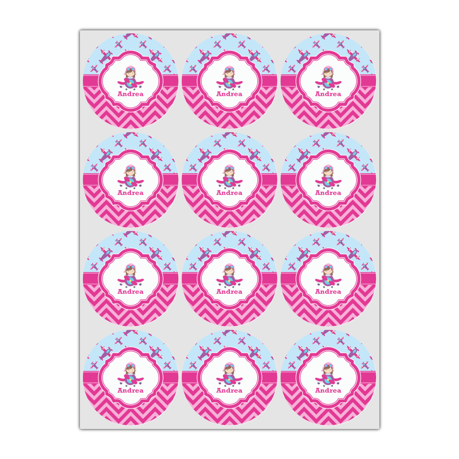 This Airplane themed design for girls features a little pilot in her own plane with her name just below it within a hot pink frame. The design also features planes in the sky above and pink chevron stripes below with a hot pink band to tie it all together.
