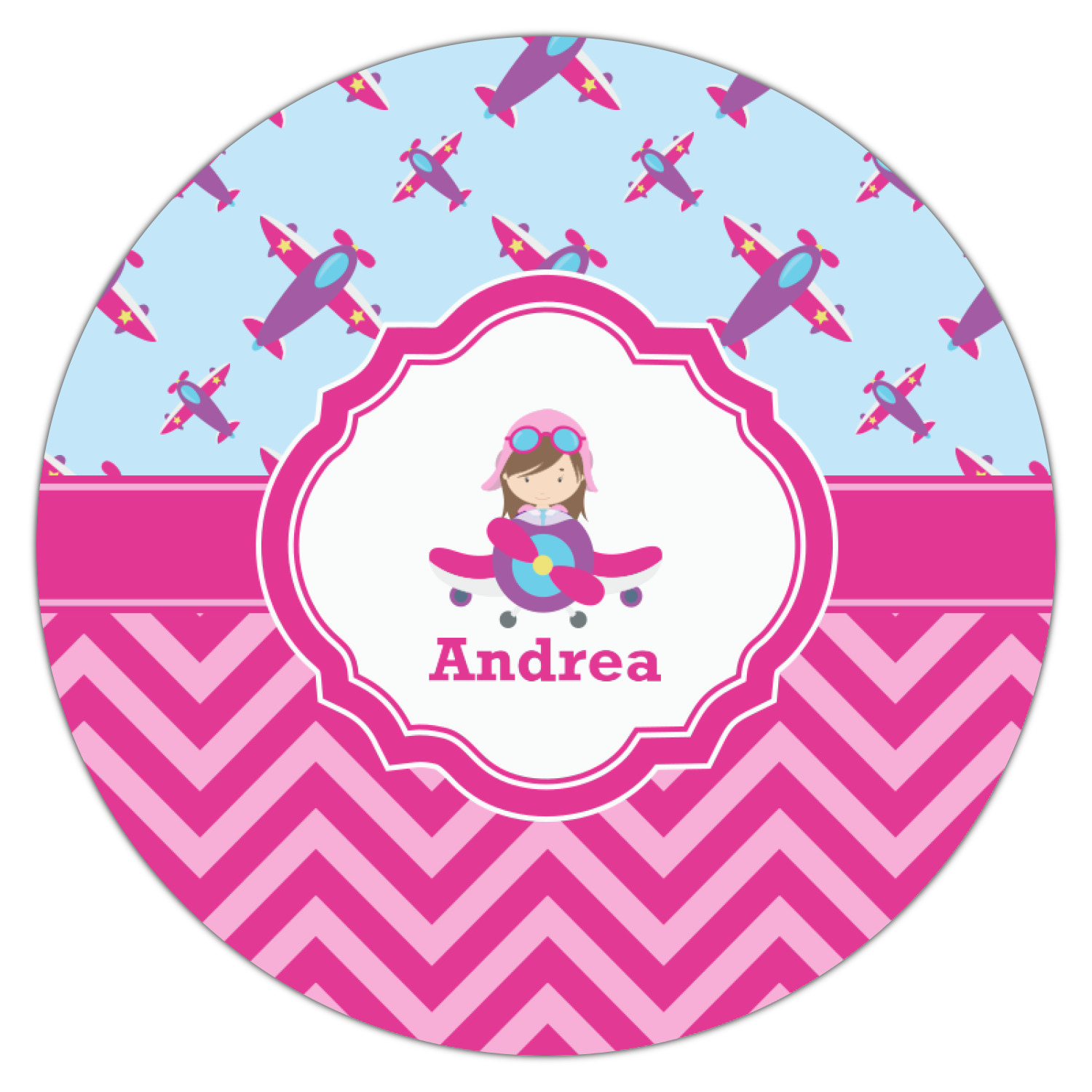 This Airplane themed design for girls features a little pilot in her own plane with her name just below it within a hot pink frame. The design also features planes in the sky above and pink chevron stripes below with a hot pink band to tie it all together.