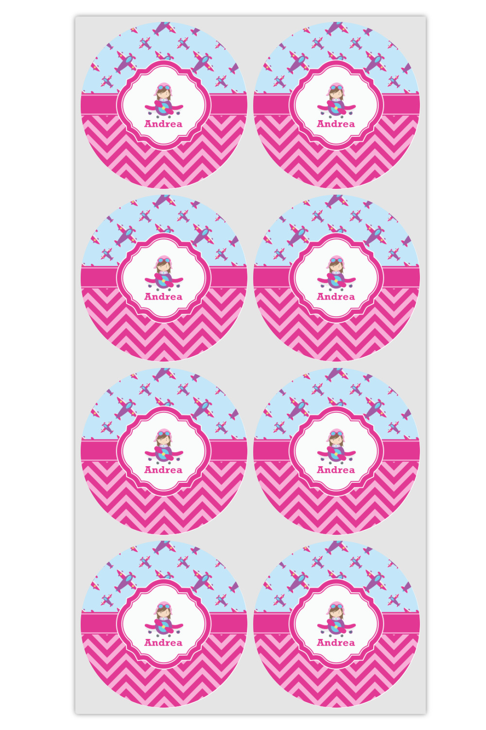 This Airplane themed design for girls features a little pilot in her own plane with her name just below it within a hot pink frame. The design also features planes in the sky above and pink chevron stripes below with a hot pink band to tie it all together.