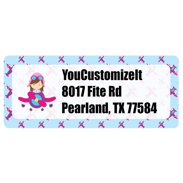 This Airplane themed design for girls features a little pilot in her own plane with her name just below it within a hot pink frame. The design also features planes in the sky above and pink chevron stripes below with a hot pink band to tie it all together.