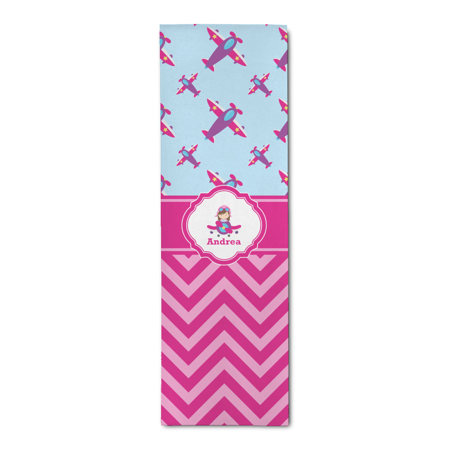 This Airplane themed design for girls features a little pilot in her own plane with her name just below it within a hot pink frame. The design also features planes in the sky above and pink chevron stripes below with a hot pink band to tie it all together.