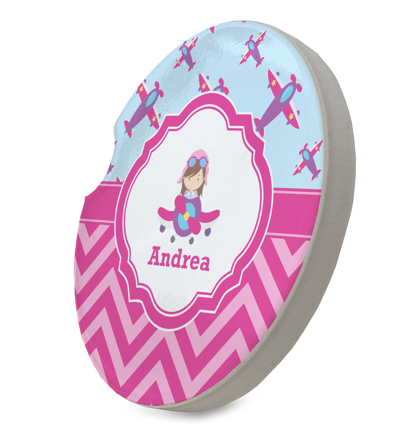 This Airplane themed design for girls features a little pilot in her own plane with her name just below it within a hot pink frame. The design also features planes in the sky above and pink chevron stripes below with a hot pink band to tie it all together.