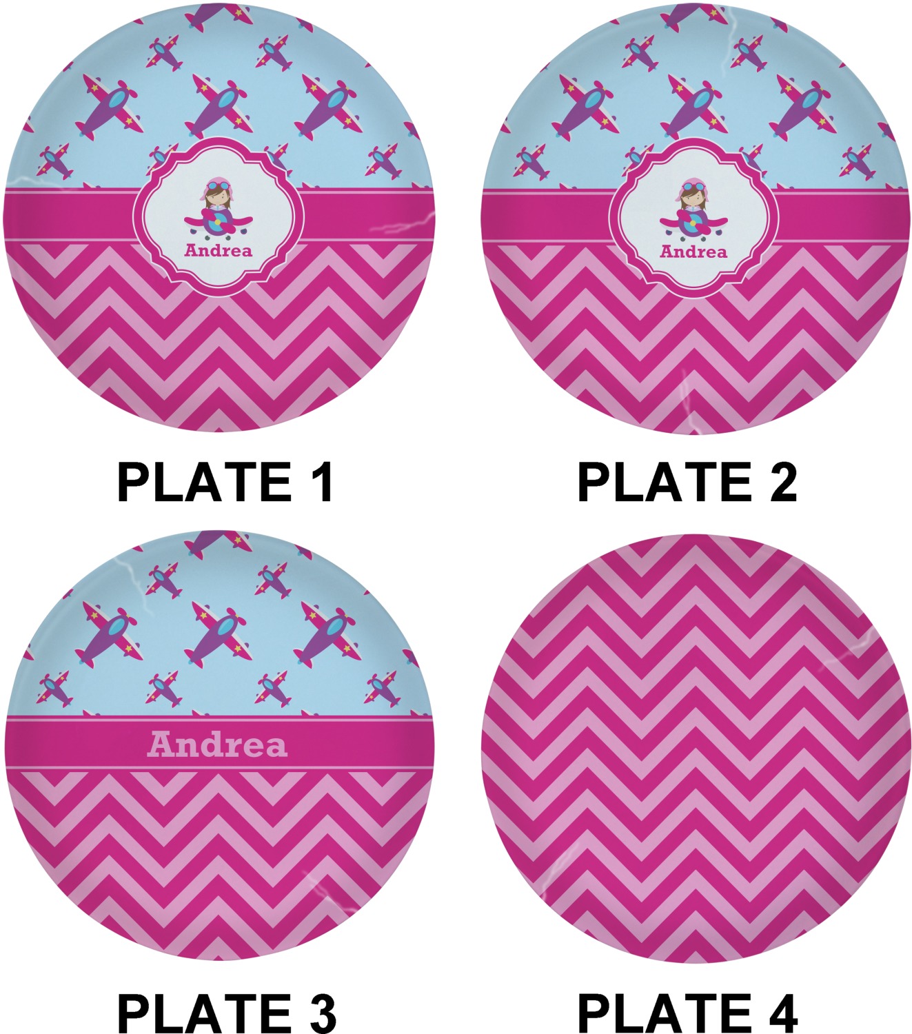 This Airplane themed design for girls features a little pilot in her own plane with her name just below it within a hot pink frame. The design also features planes in the sky above and pink chevron stripes below with a hot pink band to tie it all together.