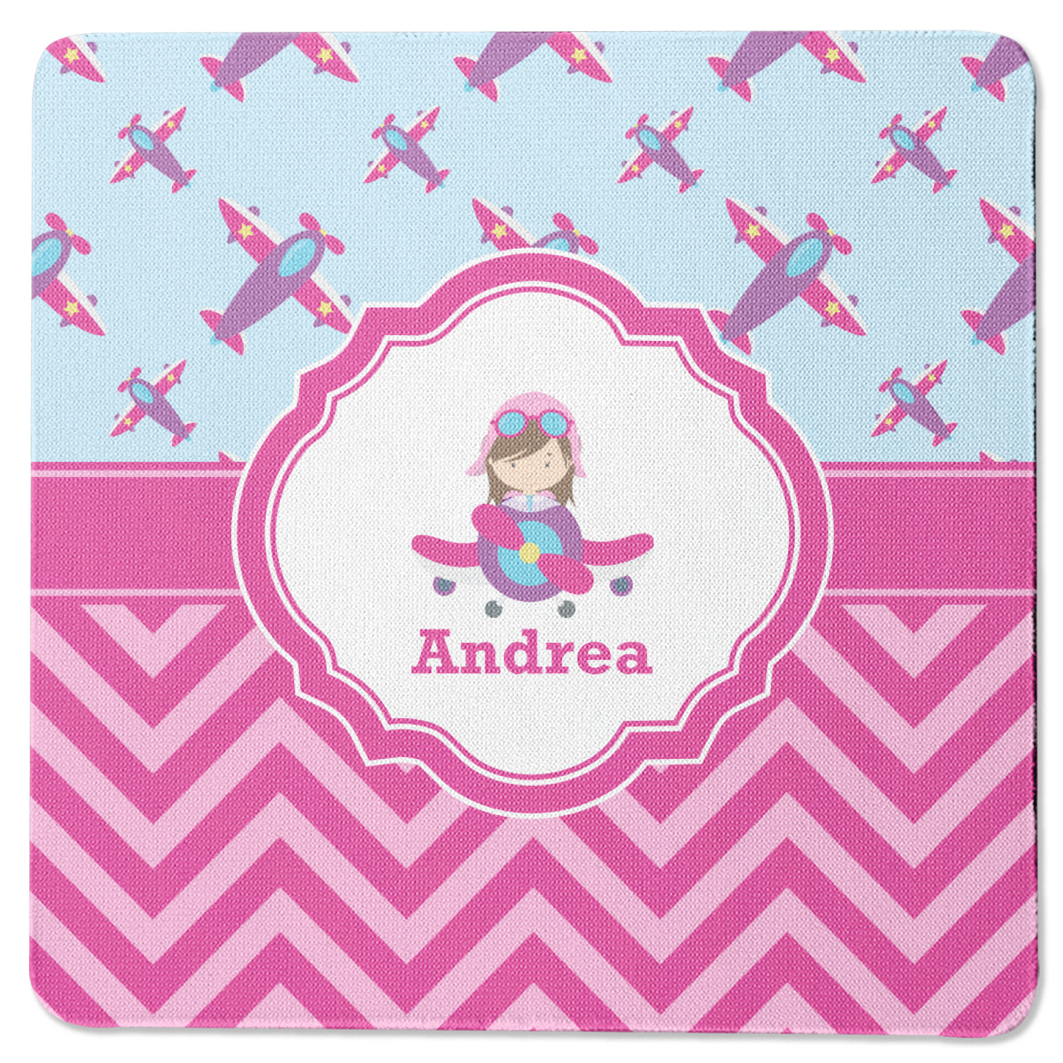 This Airplane themed design for girls features a little pilot in her own plane with her name just below it within a hot pink frame. The design also features planes in the sky above and pink chevron stripes below with a hot pink band to tie it all together.