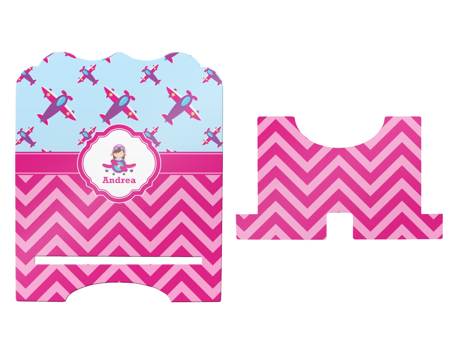 This Airplane themed design for girls features a little pilot in her own plane with her name just below it within a hot pink frame. The design also features planes in the sky above and pink chevron stripes below with a hot pink band to tie it all together.