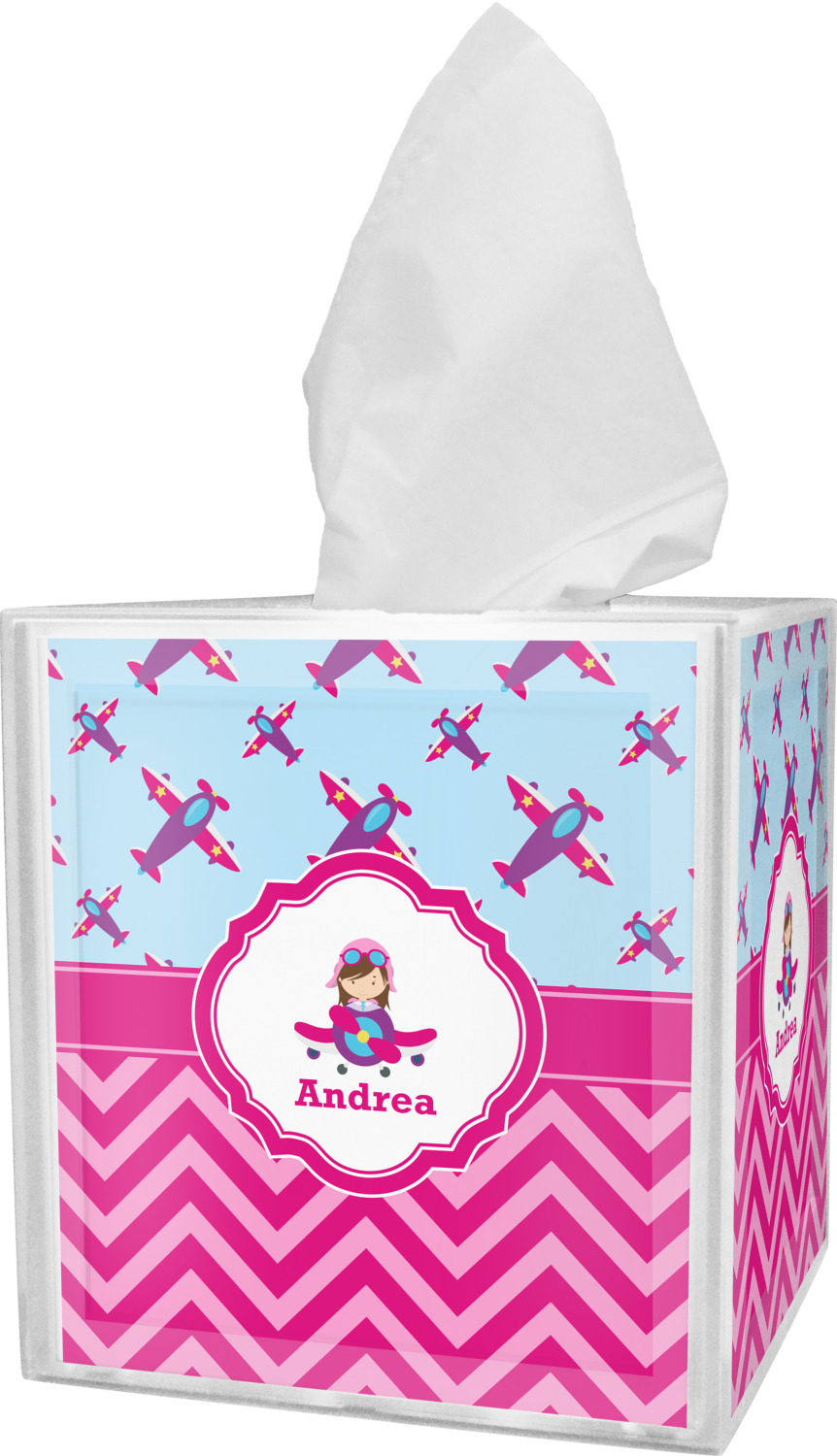 These tissue holders are built from durable acrylic and display your unique personalization on fine-quality vinyl inserts placed within the four sides and top. The box features two pieces, allowing you to easily switch out tissue boxes. On the sides, youll find ridges that ensure the top and base fit securely in place. The bottom of these tissue box holders has four, rubber, non-slip pads to prevent the box from scuffing any surface you decide to display it on. Each box can fit a standard 5 by 5-inch box of tissues.