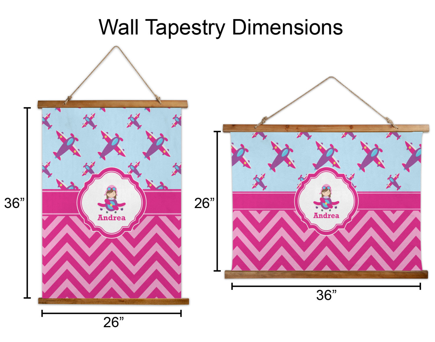 Made in two different orientations - portrait or landscape - both are 26" x 36". Your design is printed on a high quality polyester fabric with hemmed edges. The wood on the top and bottom of the tapestry is 1.25" tall and 0.25" thick and there are two pieces on top and bottom which sandwich the fabric.