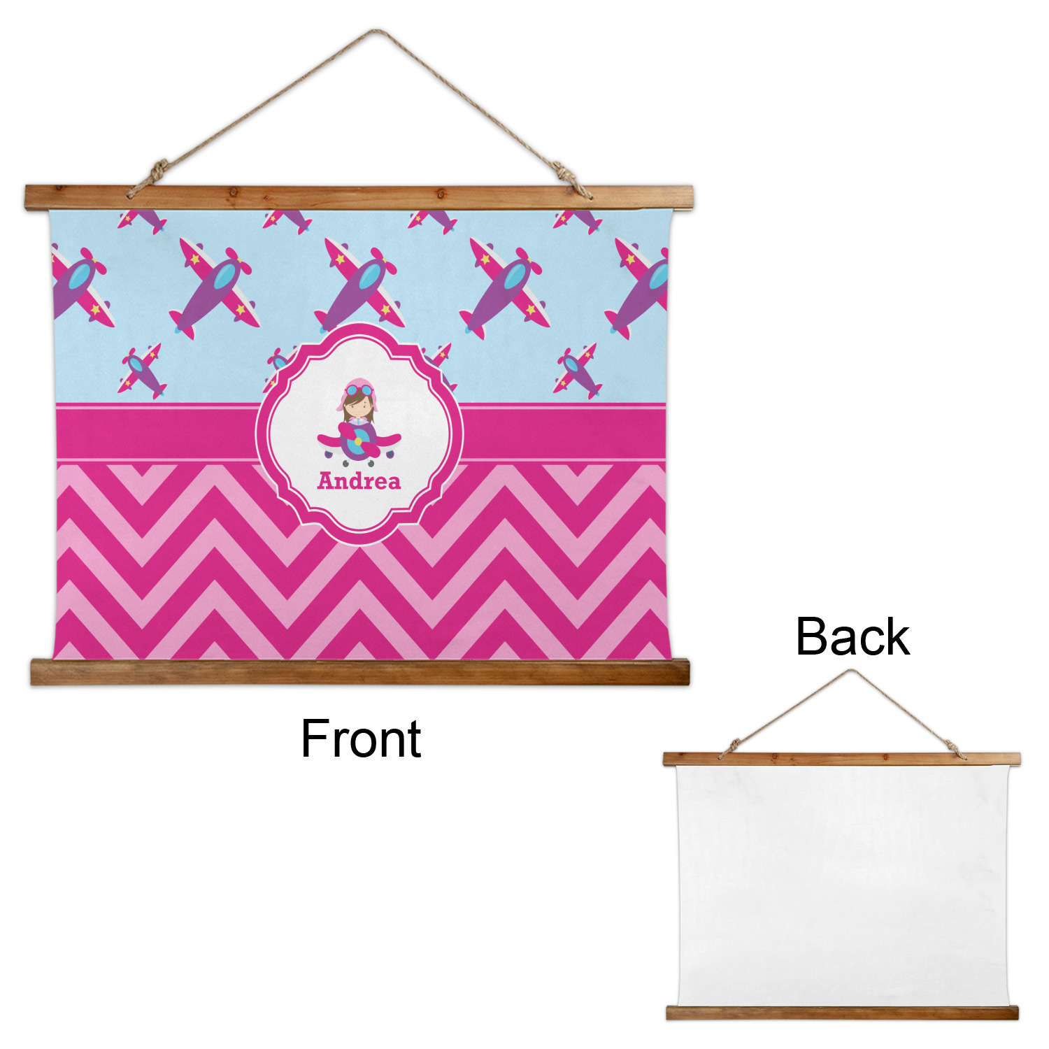 This Airplane themed design for girls features a little pilot in her own plane with her name just below it within a hot pink frame. The design also features planes in the sky above and pink chevron stripes below with a hot pink band to tie it all together.