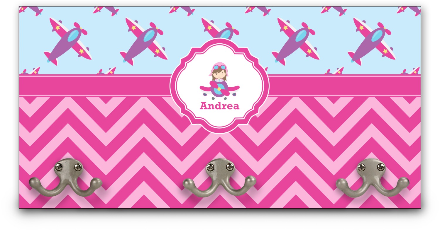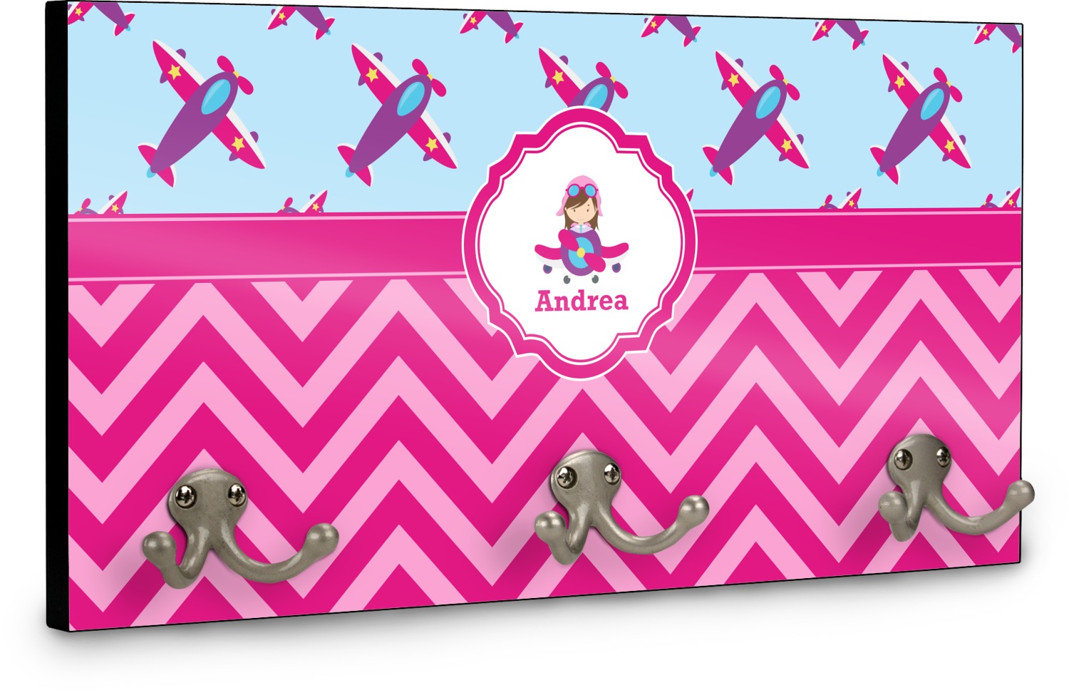 This Airplane themed design for girls features a little pilot in her own plane with her name just below it within a hot pink frame. The design also features planes in the sky above and pink chevron stripes below with a hot pink band to tie it all together.