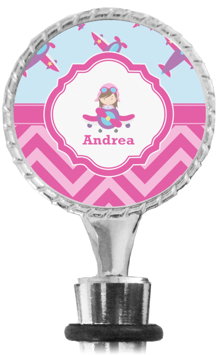 This Airplane themed design for girls features a little pilot in her own plane with her name just below it within a hot pink frame. The design also features planes in the sky above and pink chevron stripes below with a hot pink band to tie it all together.