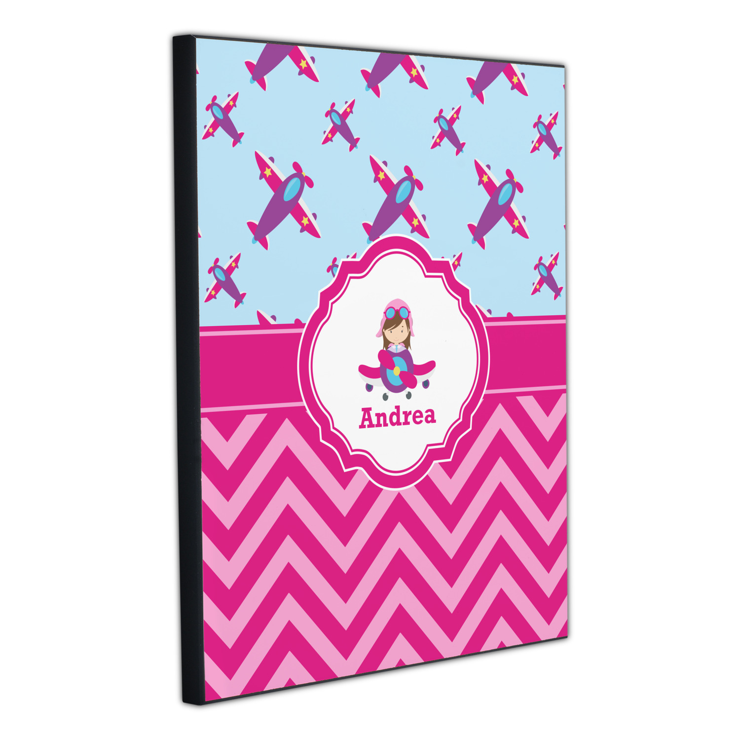This Airplane themed design for girls features a little pilot in her own plane with her name just below it within a hot pink frame. The design also features planes in the sky above and pink chevron stripes below with a hot pink band to tie it all together.