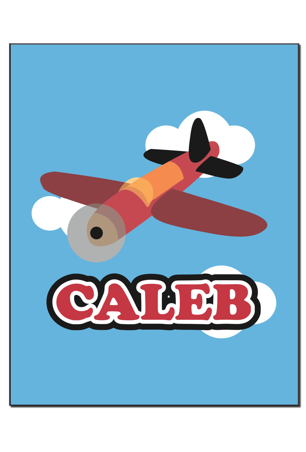 Calling all aviation enthusiast! Soaring through on a backdrop of a beautiful blue cloudy sky is our fun flying plane brightly colored in shades of reds and oranges. Don't forget to add that special touch by customizing the design with the name of your choice.