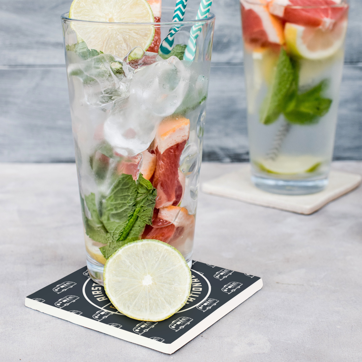 These customized stone coasters are perfect for use with beverages that are served in drinkware that "sweat". When cocktails, sodas, iced tea, water, etc. are served with ice in a regular glasses (non insulated glasses), they release condensation that drips down the outside of the glasses.