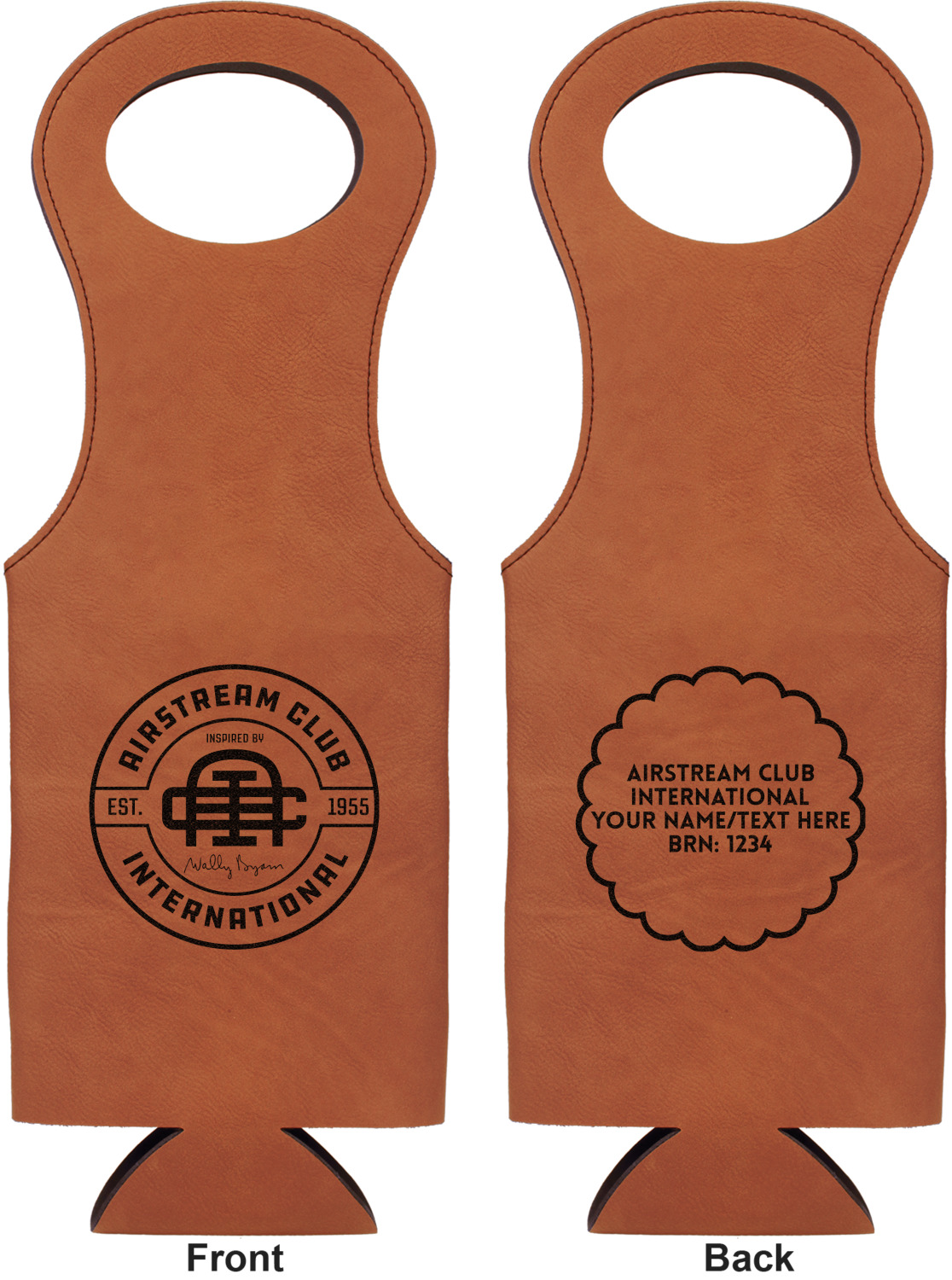 This wine carrier is made from a stunning leatherette, in a cognac-brown color. Strong, black stitching lines the sides of your wine bottle bag and provides extra durability. The interior is lined with a padded, black material to allow for a snug fit once your bottle is placed inside. At the top of this wine gift bag, you'll find two oval shaped handles that elegantly complements the rest of the bag's style. We provide you with the option of laser-engraving the front, or the front and back of your new personalized wine bag!