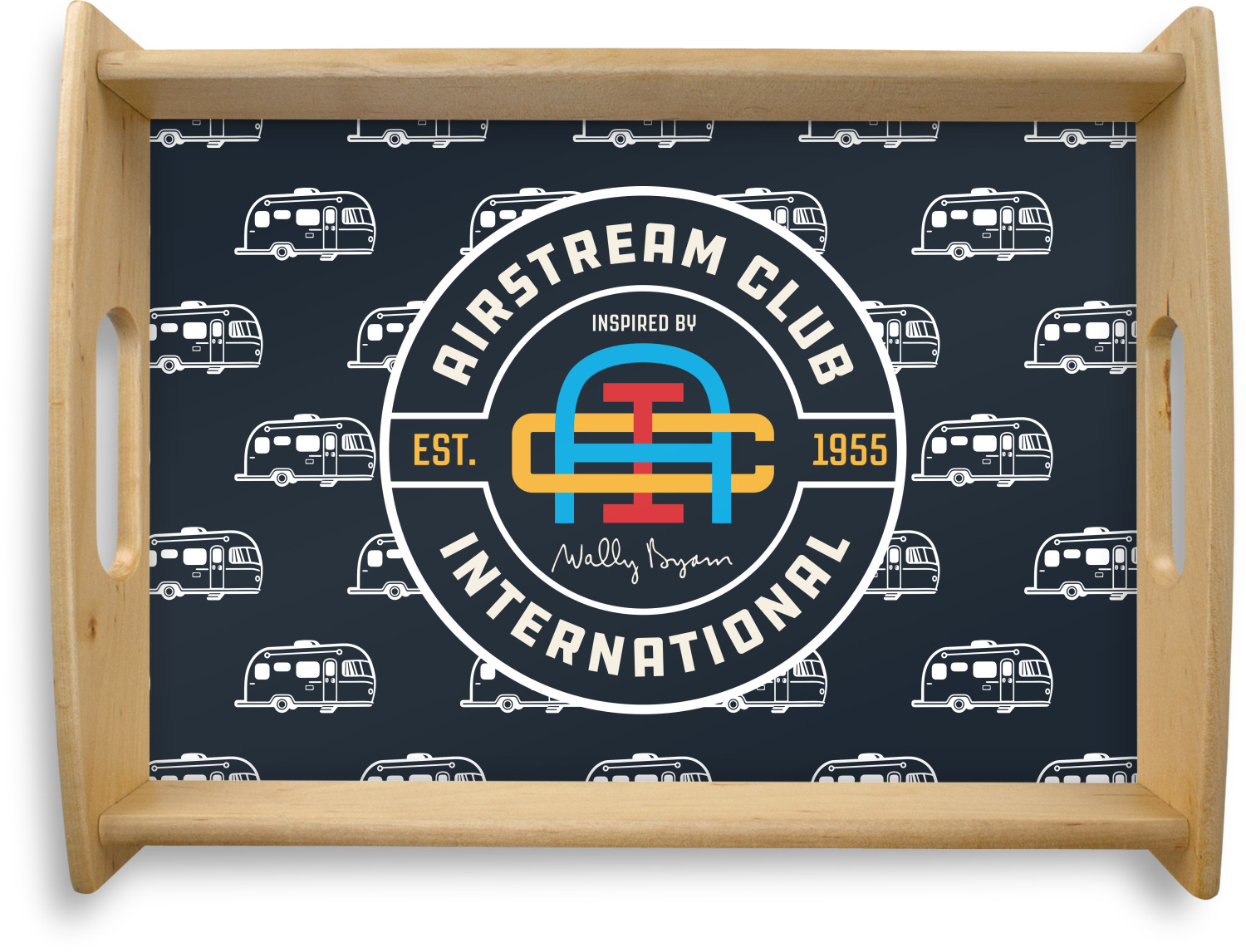 This serving tray with handles features square edges and two rounded sides, creating a very modern look. Each side is fabricated from a beautifully cut, natural wood. The bottom of the interior of the tray displays your customized design in bright, vibrant color. The tray is sold in both a black color and a natural wood look. Each variation of the wood serving tray has two sizes: Small, which is 14" x 10" x 2.25", and Large, which is 19.5" x 13.5" x 2.75".