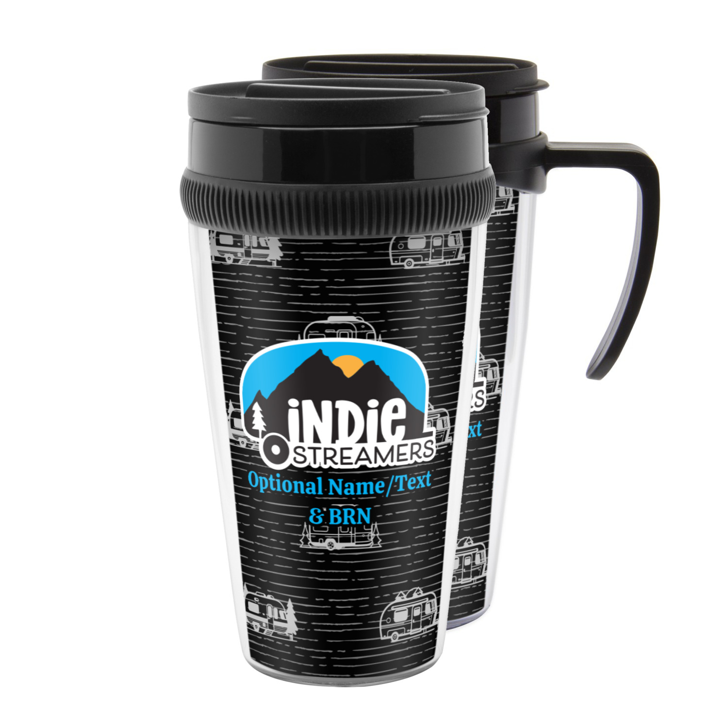 These thermal mugs are free of BPA, and insulated, to keep your drinks hot or cold. The black, snap on lid and the slider for sipping allows you to conveniently sip your drink without constantly worrying about a disastrous spill. We offer this mug with and without a handle, to better suit your needs. Each custom thermal mug holds up to 16 ounces of liquid and displays your customization on all sides on premium gloss media inserts.