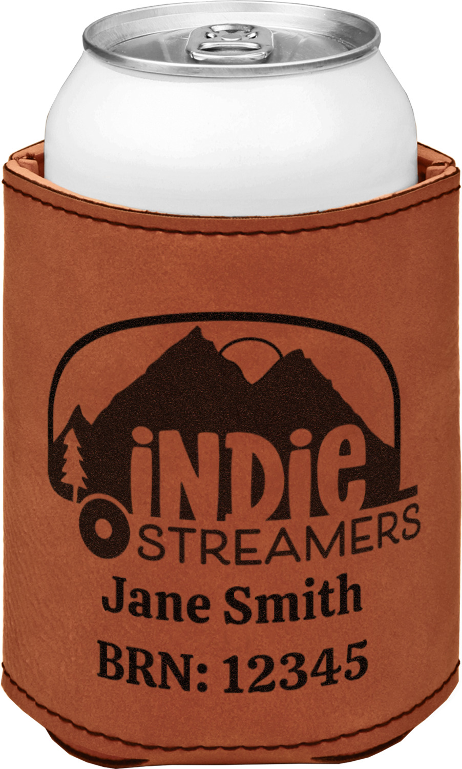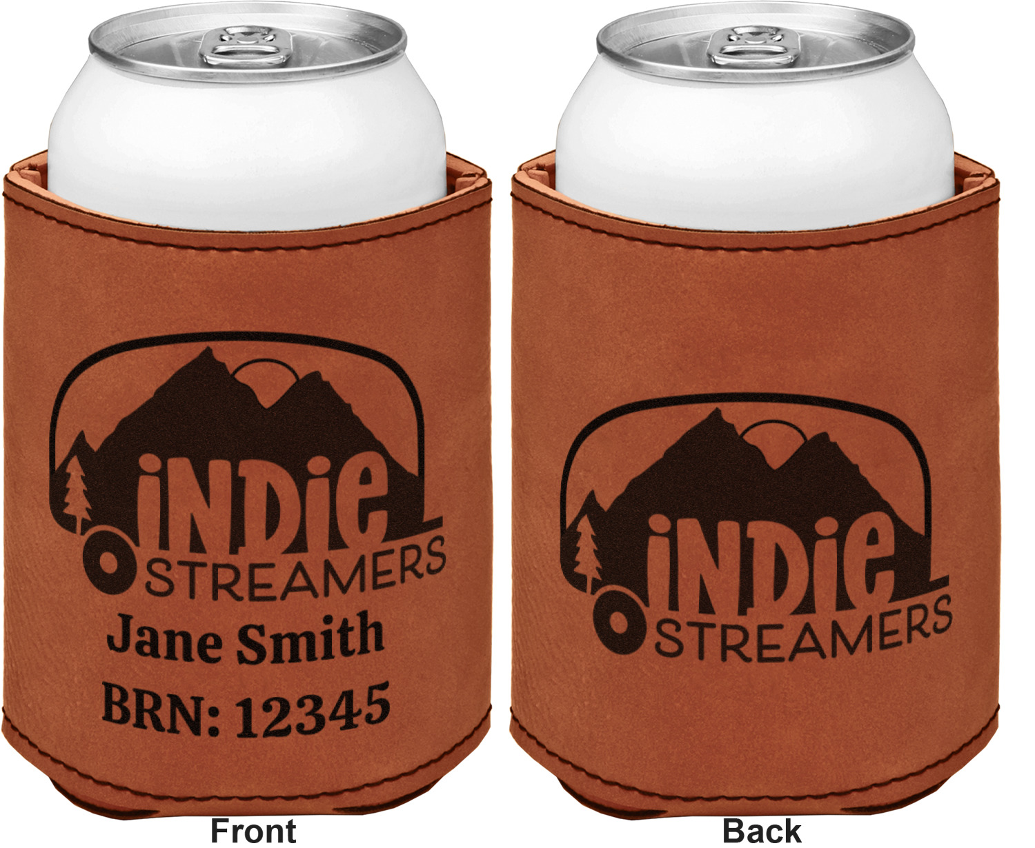 This can sleeve is made from a cognac-brown leatherette and stitched with a sturdy, black thread. A slim padding lines the inside of your can sleeve to allow for a better fit once your drink is inserted. The sleeve itself measures at 4 by 4.5 inches, allowing this custom can sleeve to accommodate most canned drinks. Your personalized design can be engraved on the front and back, or solely the front. When laser-engraved, your design appears as a black coloration which contrasts the leatherette nicely.