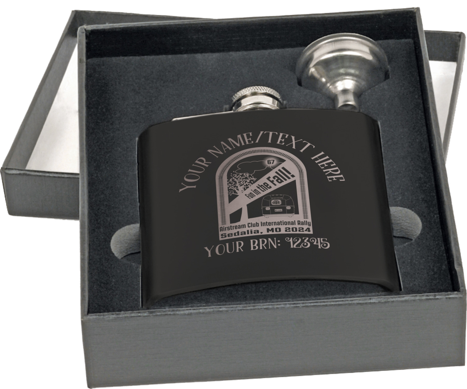 Built from a stainless steel and then covered with a black coating, this hip flask, has a very classy appearance. Similar to the standard flask, this stainless steel flask has the traditional curved shape for a snug fit in your palm. This flask set also includes a traditional screw and flip lid and liquid funnel in a gift box. At 4 by 4.5 inches, this flask can hold up to 6 ounces. Your personalized design is laser-engraved across the front of this flask.