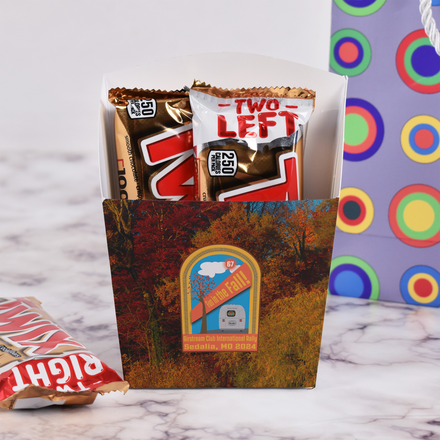 These french fry favor boxes are a pretty good size i.e. 5.25" tall x 4.25" wide x 1..625" deep. If you are not good with dimensions - it easily fits 2 full size Twix bars, or it is the size of McDonald's large fries.