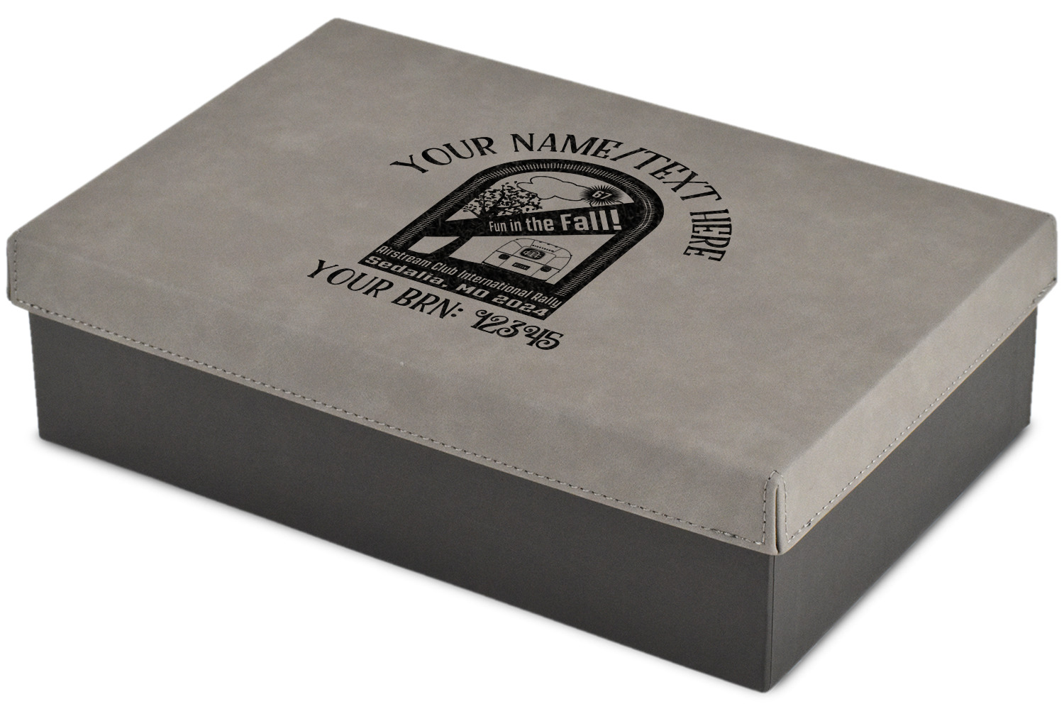 These gift boxes are available in 3 different sizes to accommodate various sized gifts. Available in gray as a neutral color for any occasion as well as to showcase your design boldly. Engraved with a laser this high quality paper board and faux leather gift box is unique and makes any gift stand out.