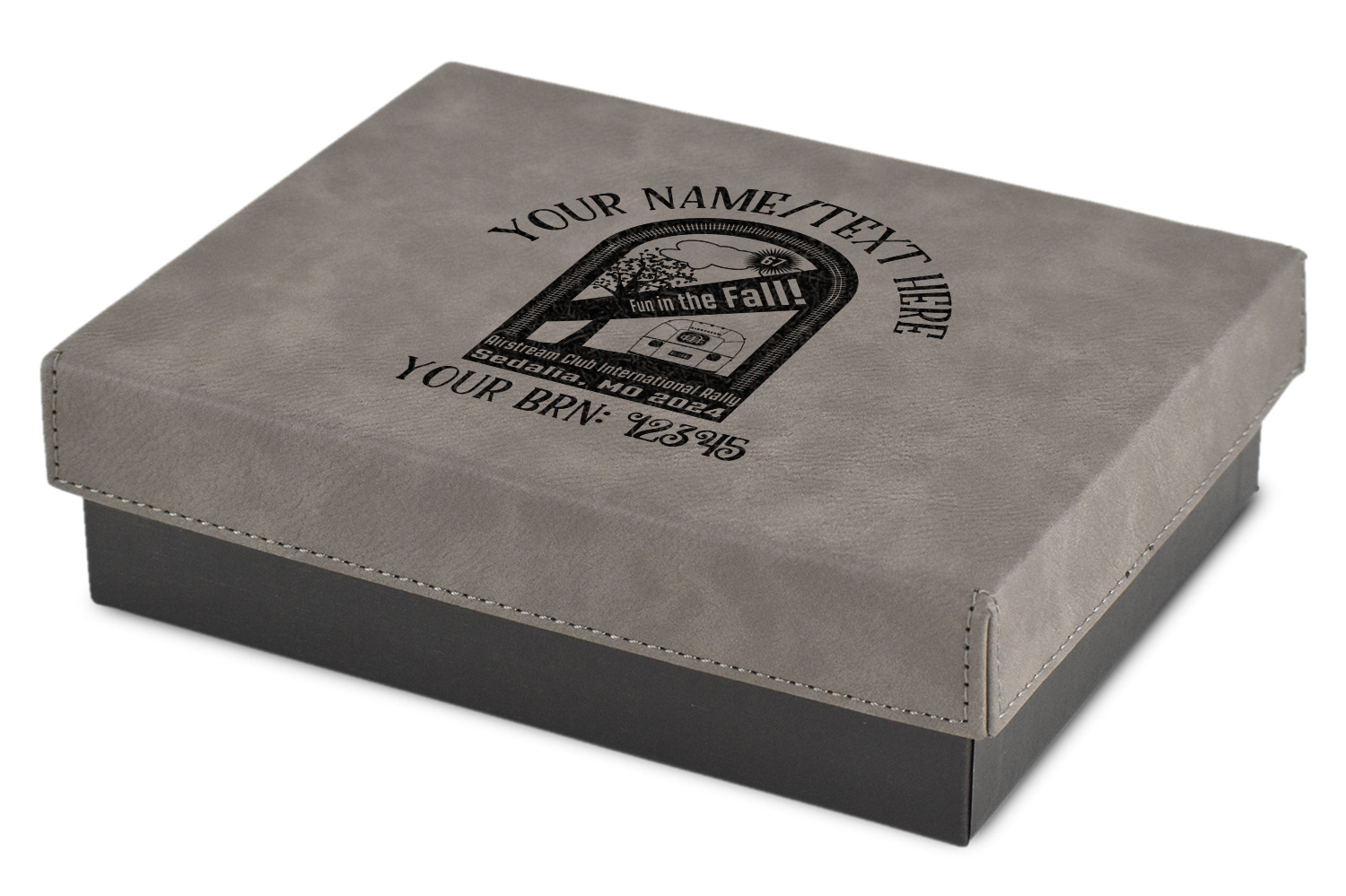 These gift boxes are available in 3 different sizes to accommodate various sized gifts. Available in gray as a neutral color for any occasion as well as to showcase your design boldly. Engraved with a laser this high quality paper board and faux leather gift box is unique and makes any gift stand out.