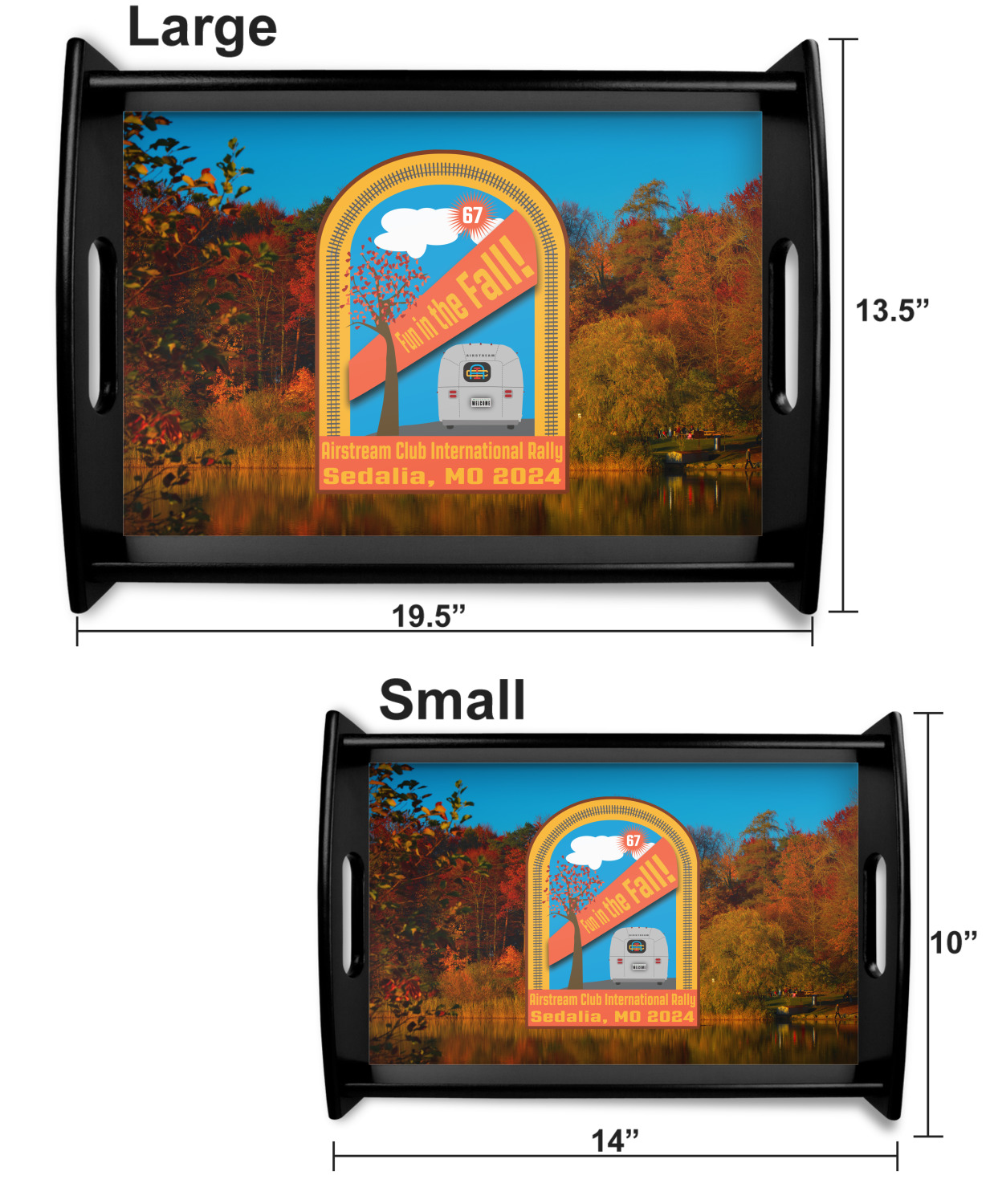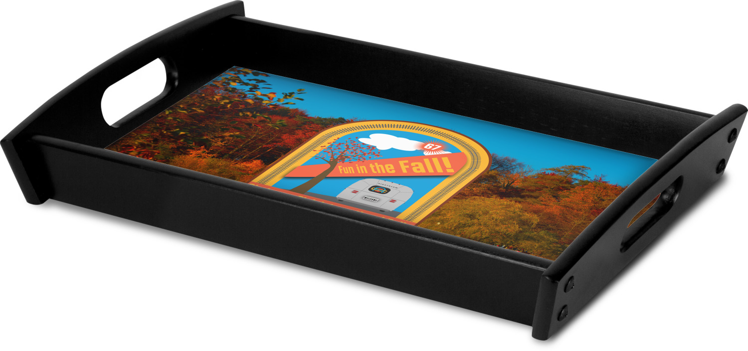This serving tray with handles features square edges and two rounded sides, creating a very modern look. Each side is fabricated from a beautifully cut, natural wood. The bottom of the interior of the tray displays your customized design in bright, vibrant color. The tray is sold in both a black color and a natural wood look. Each variation of the wood serving tray has two sizes: Small, which is 14" x 10" x 2.25", and Large, which is 19.5" x 13.5" x 2.75".