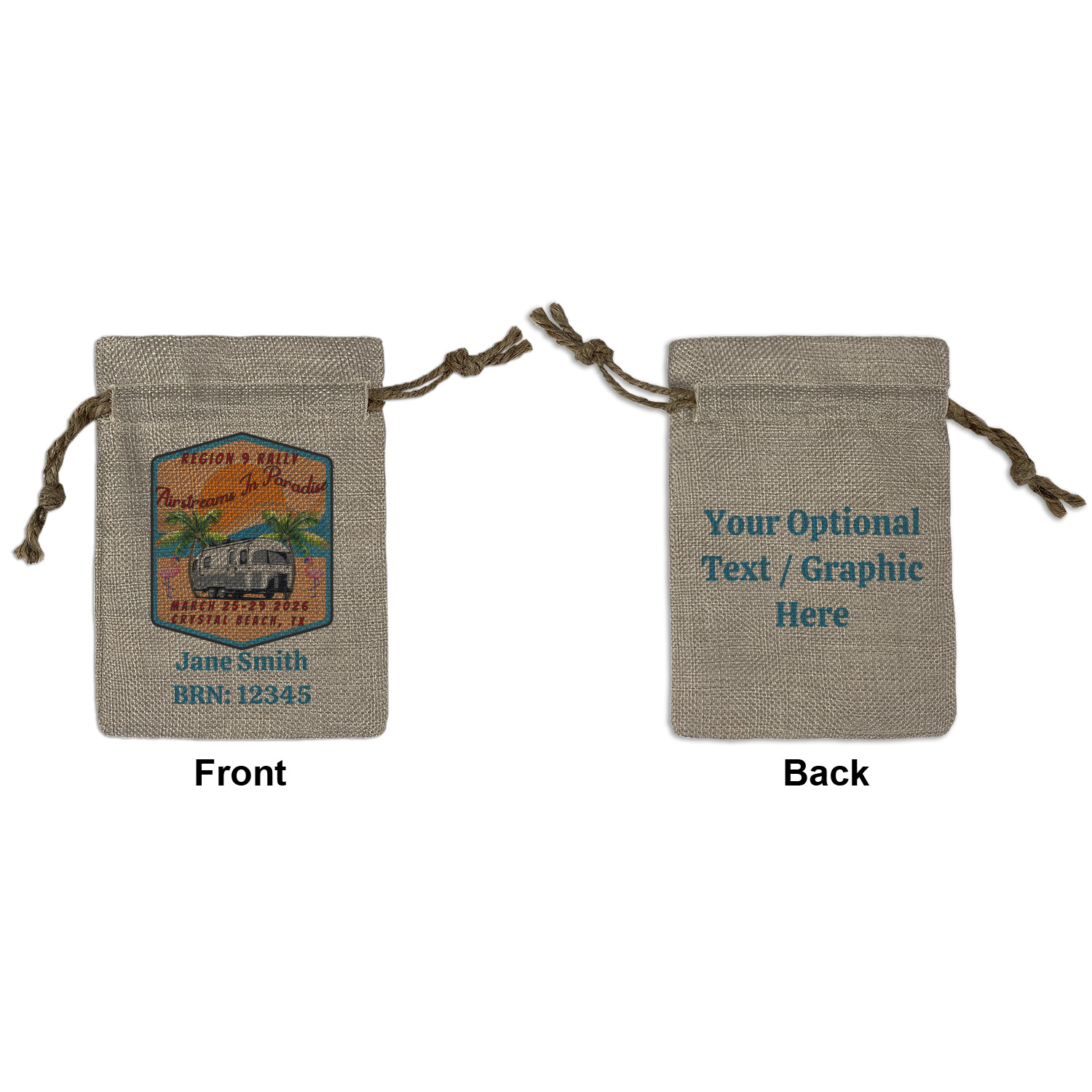 We sell our Burlap Gift Bags in 3 variant sized bags. Made with burlap polyester, each personalized bag can be secured with a twine drawstring pull. Your custom design is available to print on one side or both sides - completely up to you! The sizes of the bags measure approximately 4.5" x 6.5" for the smallest size, 6.5" x 8.0" for the medium size, and 6.5" x 13.5" for the large-sized bag.
