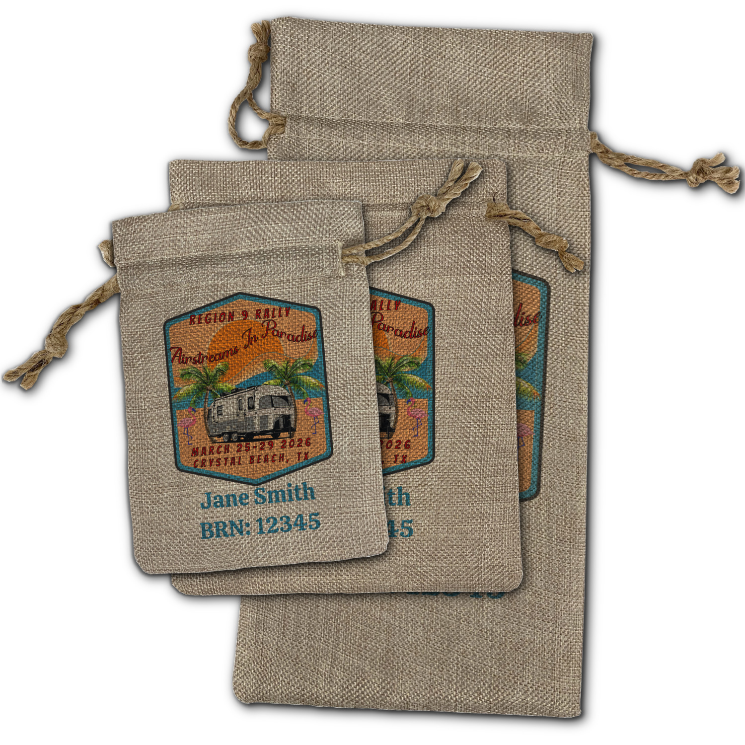 We sell our Burlap Gift Bags in 3 variant sized bags. Made with burlap polyester, each personalized bag can be secured with a twine drawstring pull. Your custom design is available to print on one side or both sides - completely up to you! The sizes of the bags measure approximately 4.5" x 6.5" for the smallest size, 6.5" x 8.0" for the medium size, and 6.5" x 13.5" for the large-sized bag.