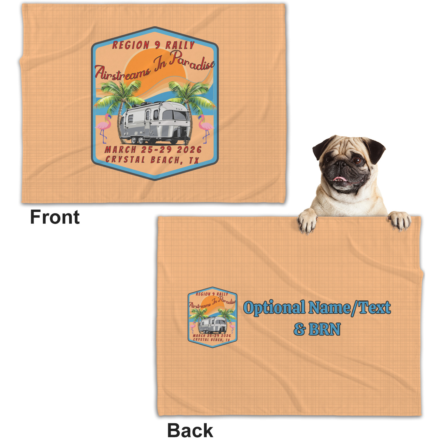 These dog blankets are crafted from a gentle, soft-to-the-touch, minky material. We print your customizations, either matching or differing, on both the top and underside of the blanket. These personalized dog blankets are available in two sizes: regular and large. Our regular size, at 40" x 30", accommodates small and some medium size dogs. At 60" x 50", our large dog blanket is a better fit for bigger breeds. Though specialized for dogs, these blankets still make a thoughtful gift for your favorite feline, or any other pet in mind!