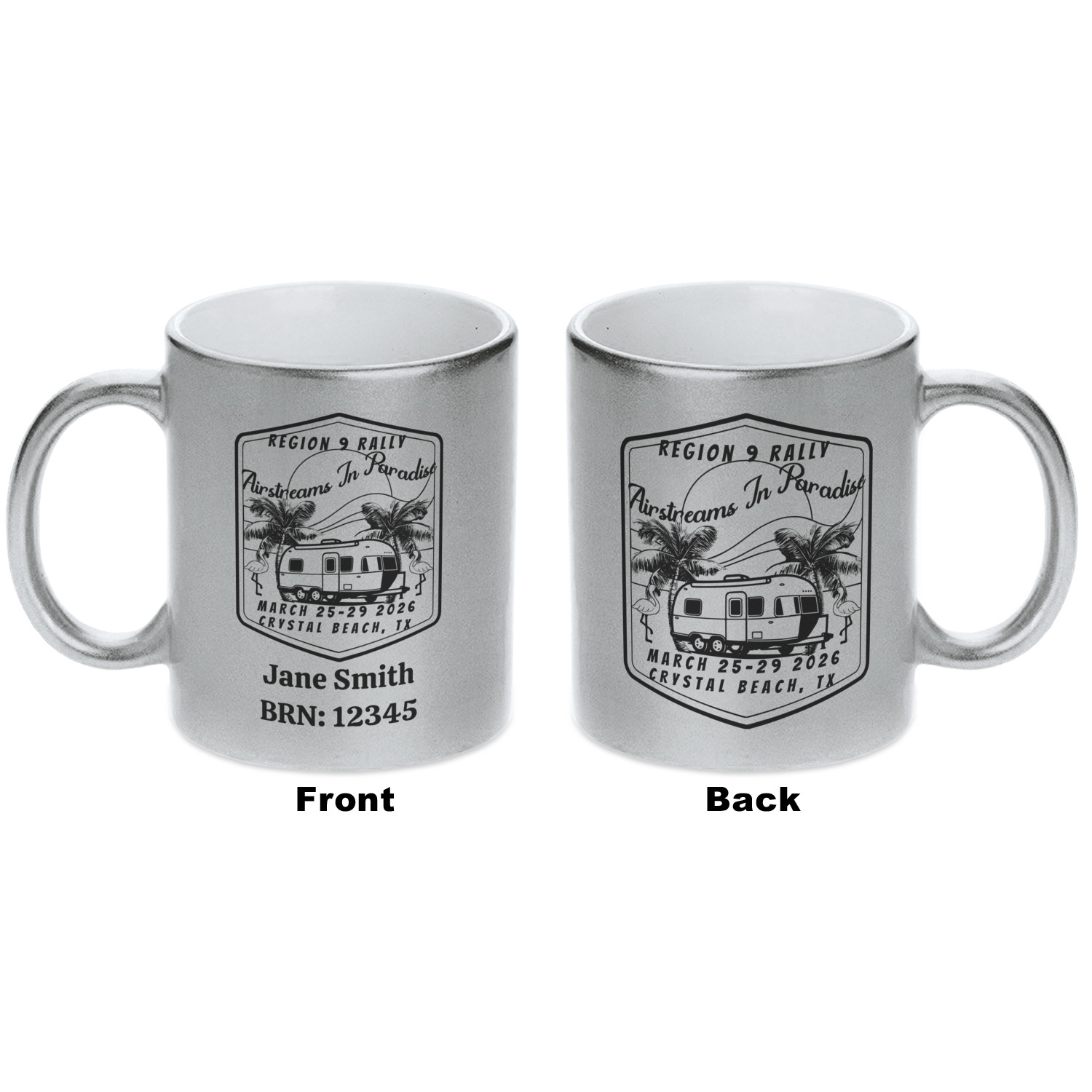 Our custom mugs are ceramic, which is great for keeping your tea or coffee warm! We offer two metallic mugs to personalize - Silver or Gold. Both styles hold around 11oz and have dimensions of approximately 3.75" x 3.5" x 4.75". Both the metallic mugs come in a matte finish and have glitter detailing to add a more pristine feel to the gold and silver base colors.