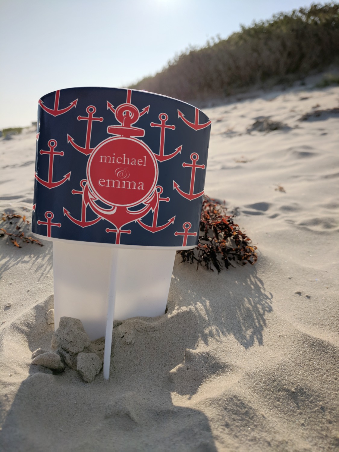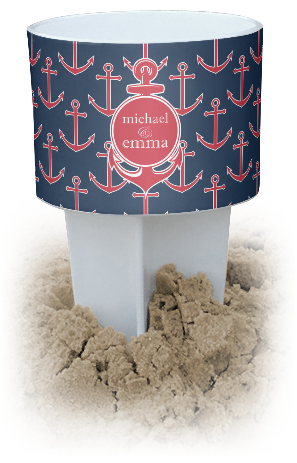 This cup holder has a large stake at its bottom that anchors it to the sand or ground below, while the cup holder rests above the stake. The entire drink holder is made of durable plastic and displays your customization around the cup holder portion. We sell these personalized beach spikers in two different colors: black and white.