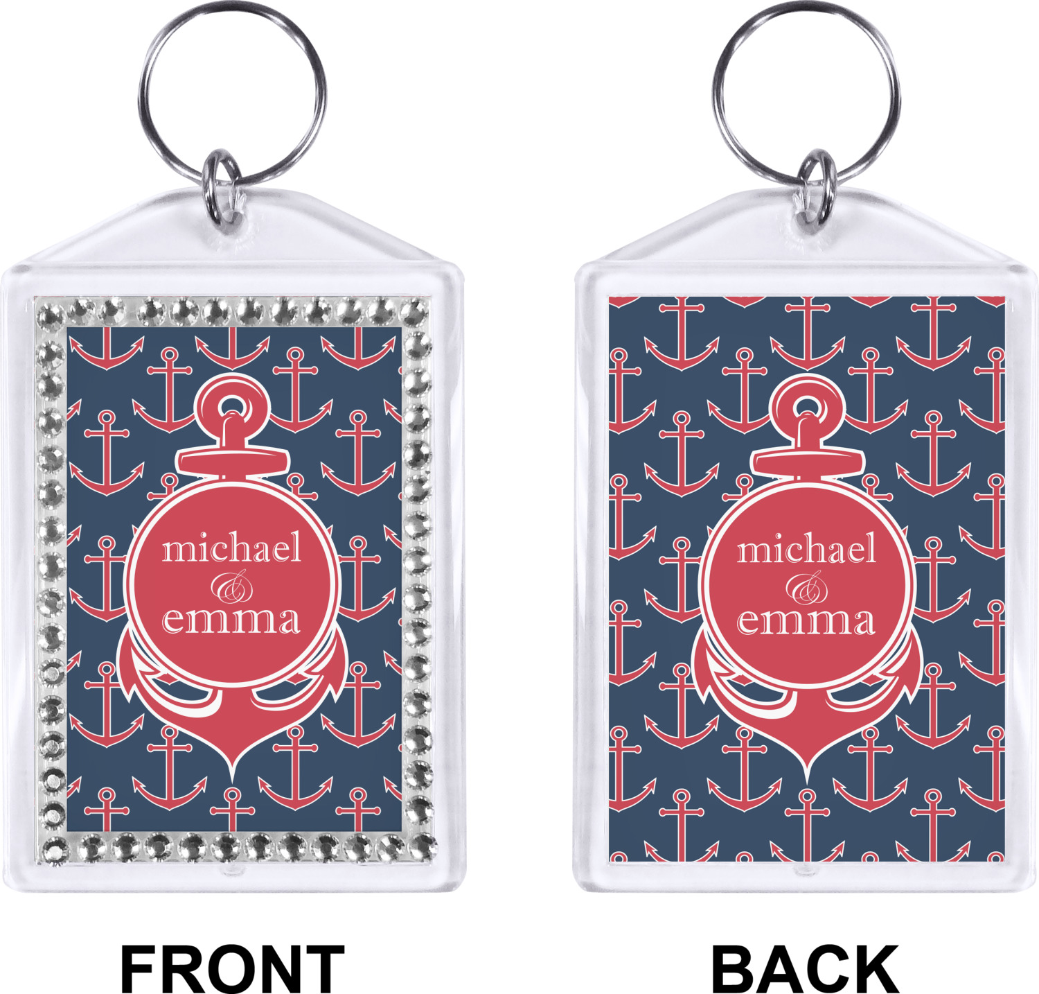 Our personalized keychains have a bold, rectangular shape, outlined by a series of shimmering rhinestones. A metal, split keyring is included with your purchase, and an additional metal hoop allows for attachment of the keychain to the split ring. This unique keychain measures at about 3.75 by 2.5 inches. We print your customized design(s) across both the back and front of this keychain.