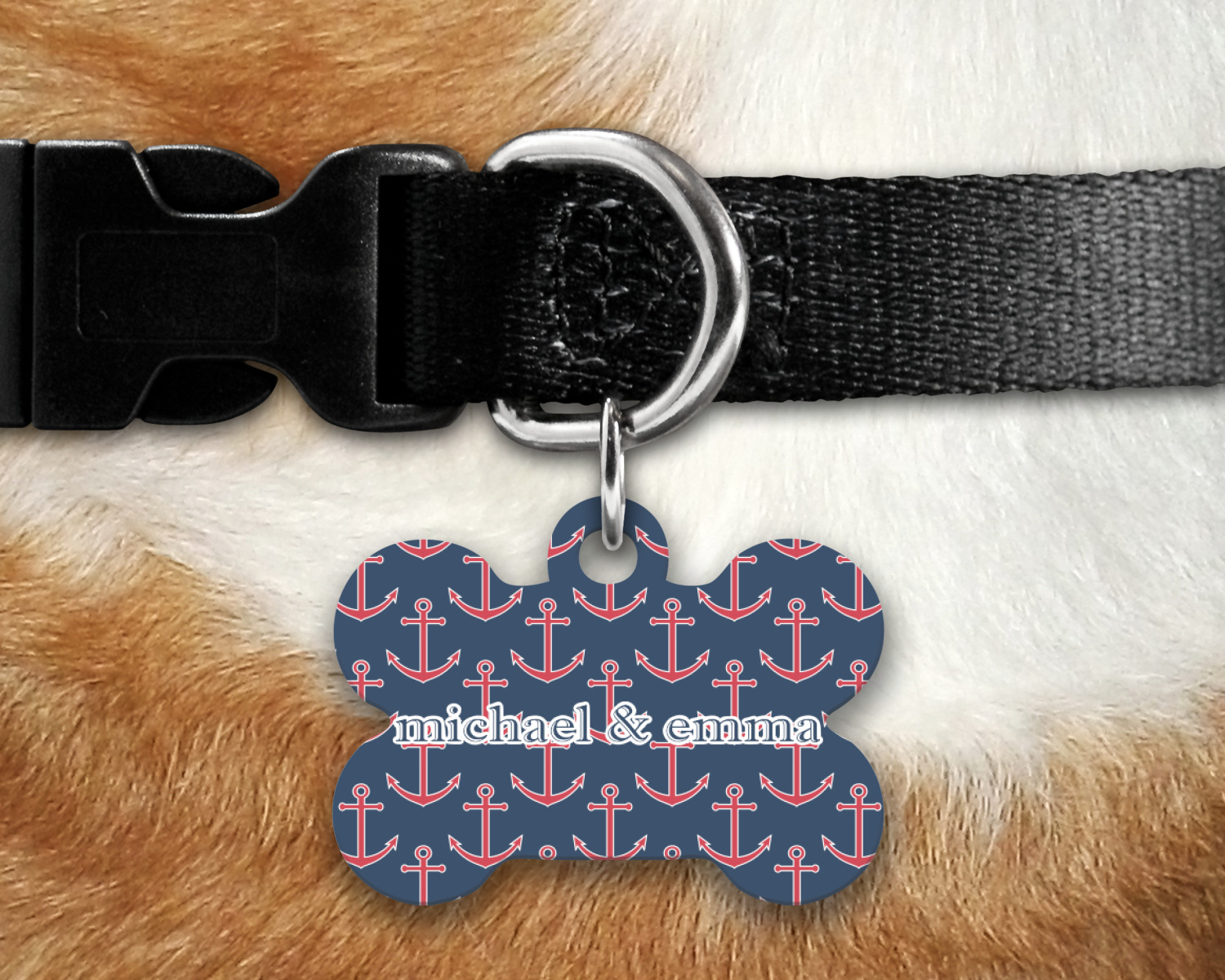 Our default design templates print your dog's personalization on the front and your contact information on the back; however everything is customizable, so you customize the patterns, the colors, the personalization, the contact information etc.