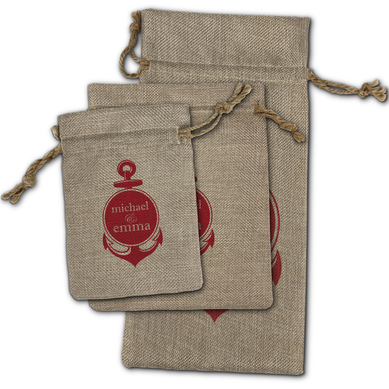 We sell our Burlap Gift Bags in 3 variant sized bags. Made with burlap polyester, each personalized bag can be secured with a twine drawstring pull. Your custom design is available to print on one side or both sides - completely up to you! The sizes of the bags measure approximately 4.5" x 6.5" for the smallest size, 6.5" x 8.0" for the medium size, and 6.5" x 13.5" for the large-sized bag.