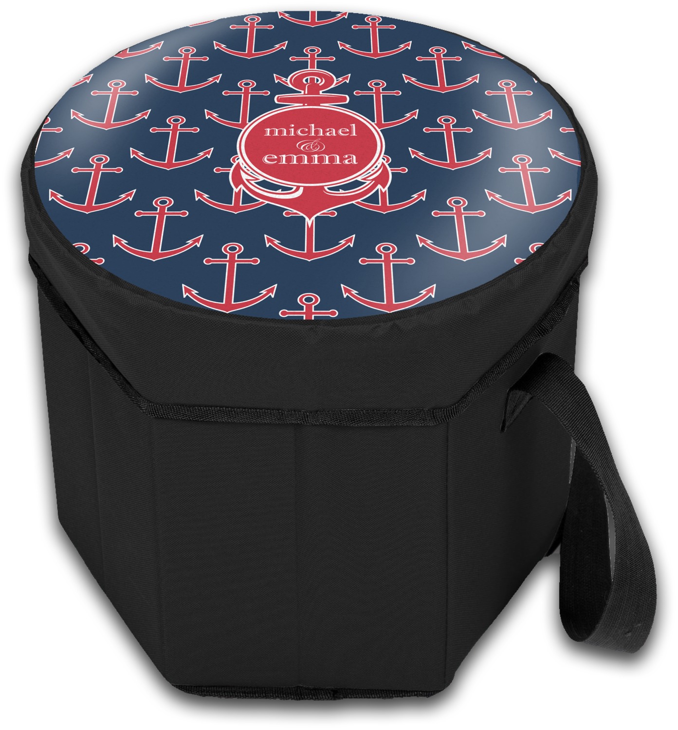 Our collapsible insulated coolers feature a unique six-sided hexagon shape, are lightweight, durable and can be turned into a seat. This cooler is fully insulated with silver foil lining to keep food and drinks hot or cold, and has a 12-quart capacity. Although this cooler collapses for easy transport, hidden inside are composition panels made of sturdy wood that give the frame strength and allow this cooler to be used as a seat. Simply sit down on the personalized cover and give your legs a break! (Maximum weight capacity of 200 pounds.)