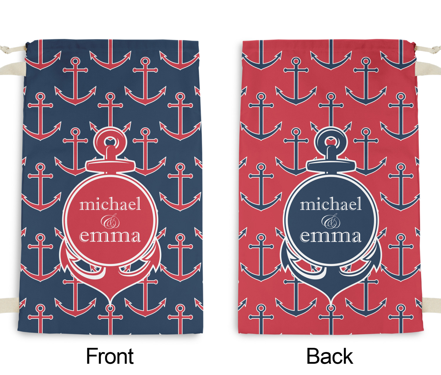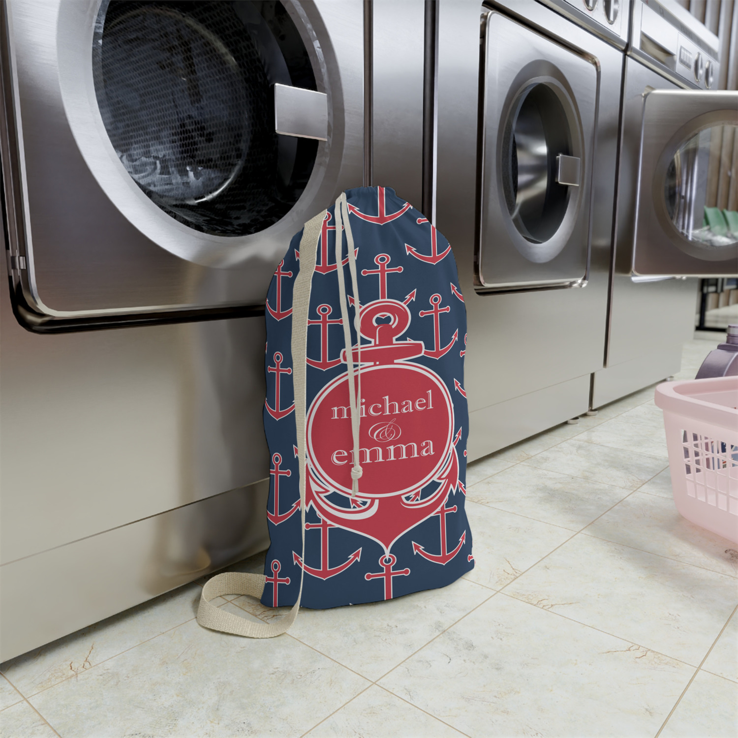 Carry your laundry in style with these customized laundry bags. Available in two sizes, featuring a natural colored woven strap and a cinch cord, these bags hold a lot of clothes or anything else you want to fit in them.