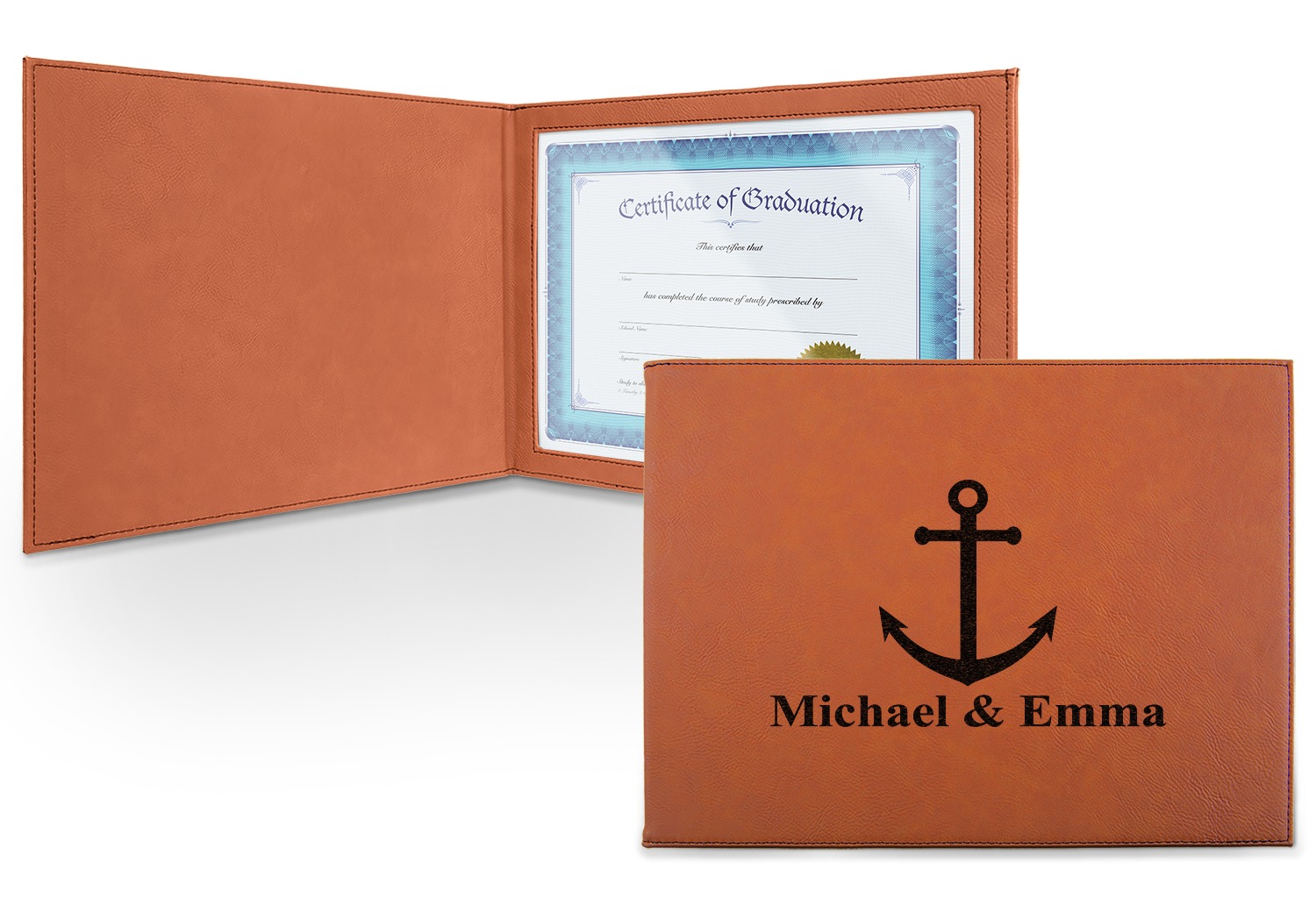 This cognac-colored, leatherette certificate jacket is the ideal way to display or store your hard-earned certificate. When closed, the custom certificate holder measures at 12 by 9 inches. The interior of the certificate cover includes a clear, vinyl window to encase your diploma. The window measures at around 10.5 by 7.5 inches and can accommodate a diploma that measures at up to 8.5 by 11 inches. You can either choose to have your customization laser engraved on the front and interior, or solely the front.