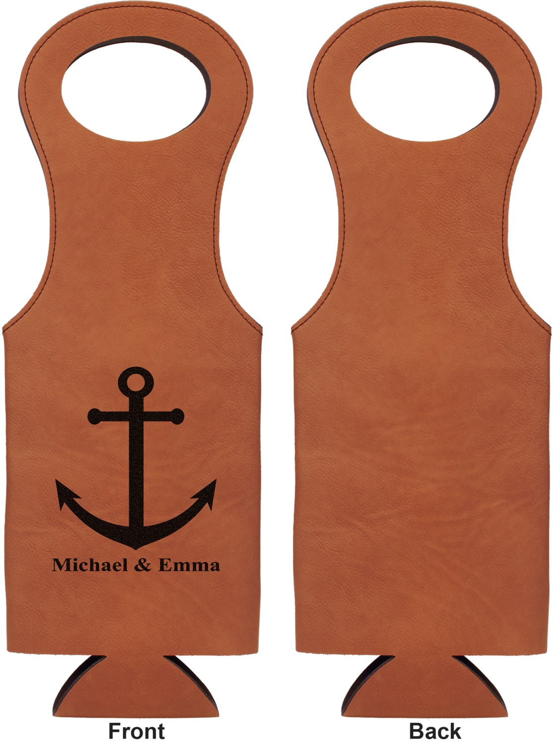 This wine carrier is made from a stunning leatherette, in a cognac-brown color. Strong, black stitching lines the sides of your wine bottle bag and provides extra durability. The interior is lined with a padded, black material to allow for a snug fit once your bottle is placed inside. At the top of this wine gift bag, you'll find two oval shaped handles that elegantly complements the rest of the bag's style. We provide you with the option of laser-engraving the front, or the front and back of your new personalized wine bag!