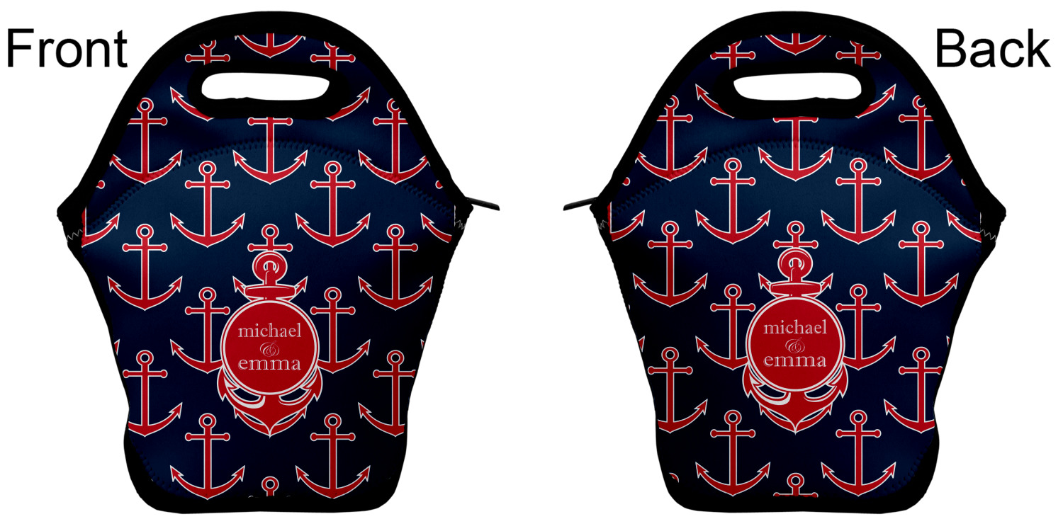 Our personalized lunch bags are made from a strong neoprene, and secure with a zipper closure that lines the top of the bag.The edges of the neoprene are sewn together with a heavy duty stitch, adding to the durability of the bag. The is accompanied by a reinforced handle at its top, for the easy transport of your lunch. We display your personalization across both the front and back of this neoprene lunch bag, while the remaining sides are a sleek black in color. Each bag measures at 13.5 inches tall, and 11.5 inches wide.