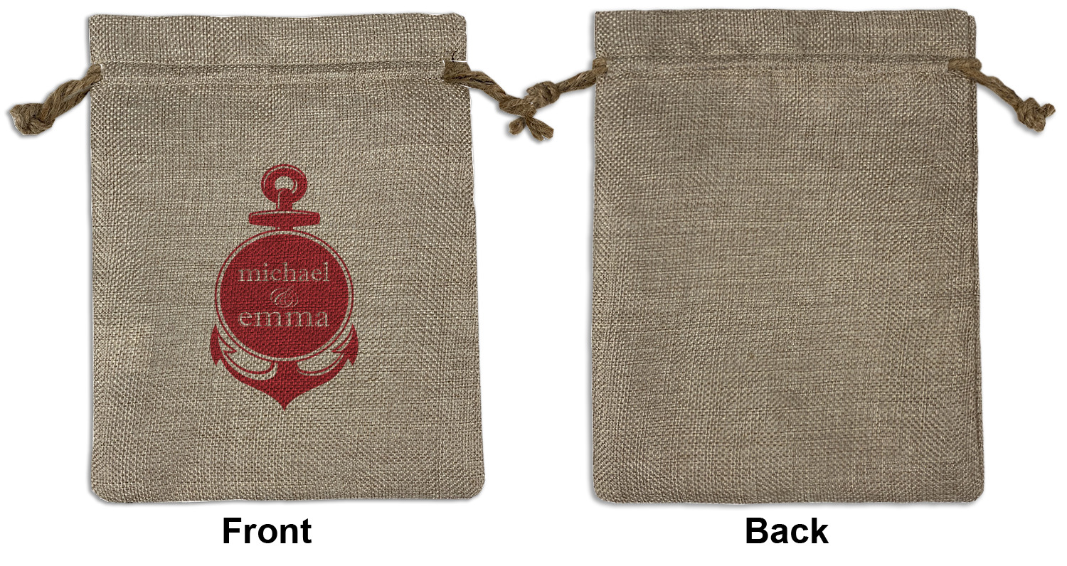 We sell our Burlap Gift Bags in 3 variant sized bags. Made with burlap polyester, each personalized bag can be secured with a twine drawstring pull. Your custom design is available to print on one side or both sides - completely up to you! The sizes of the bags measure approximately 4.5" x 6.5" for the smallest size, 6.5" x 8.0" for the medium size, and 6.5" x 13.5" for the large-sized bag.