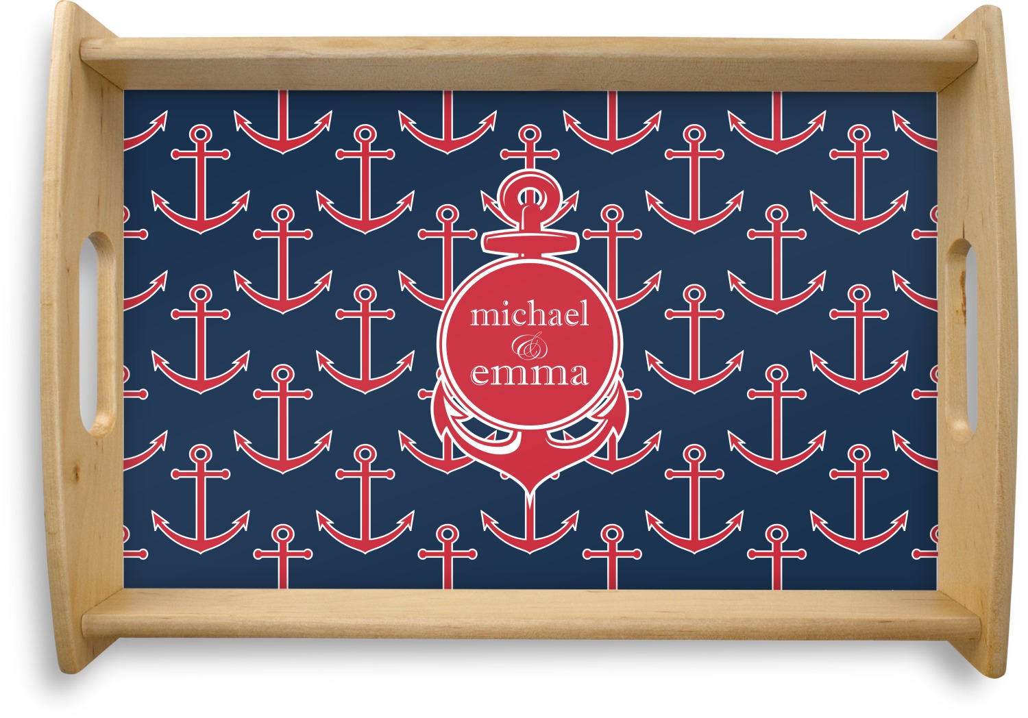 This serving tray with handles features square edges and two rounded sides, creating a very modern look. Each side is fabricated from a beautifully cut, natural wood. The bottom of the interior of the tray displays your customized design in bright, vibrant color. The tray is sold in both a black color and a natural wood look. Each variation of the wood serving tray has two sizes: Small, which is 14" x 10" x 2.25", and Large, which is 19.5" x 13.5" x 2.75".