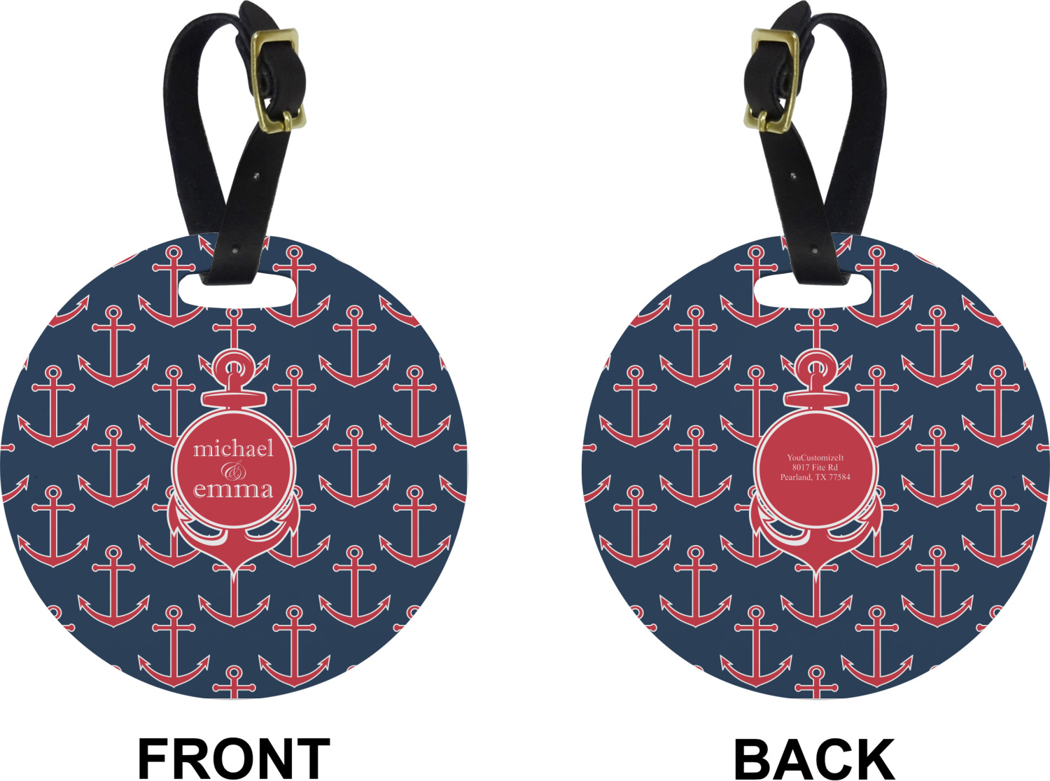 These personalized bag tags are sold in a variety of shapes, so that you may find the product that meets your vision exactly. We sell a round luggage tag, which measures at approximately 4" x 4". Our square luggage tag is about 3.5" x 3.5", while our rectangular version is 2.75" x 4 ".
