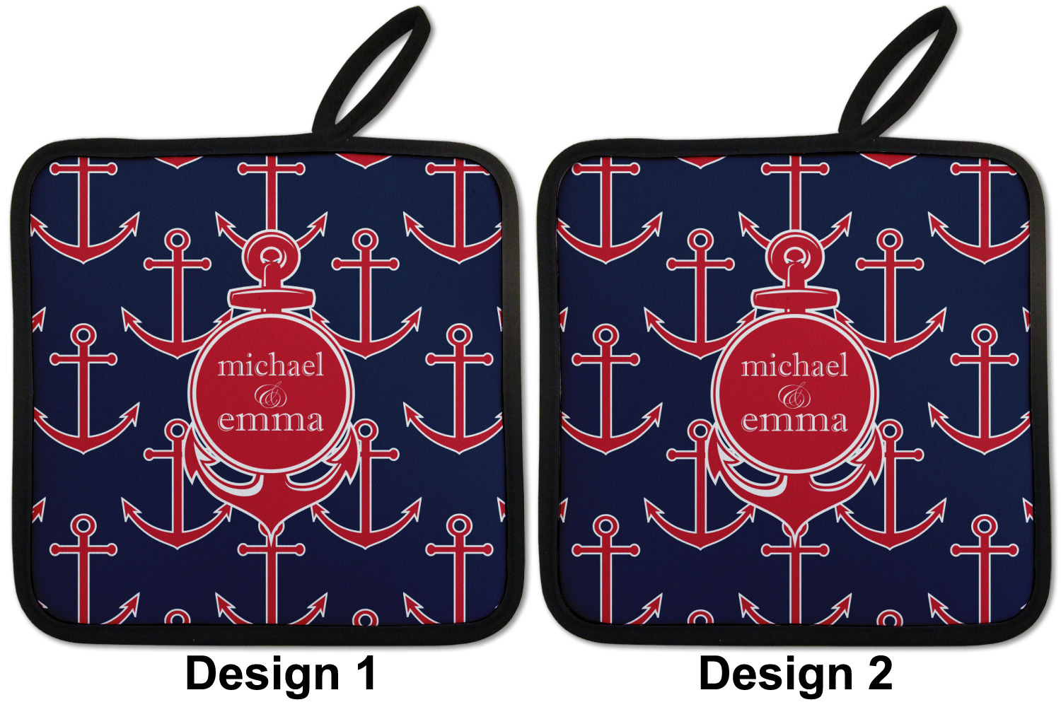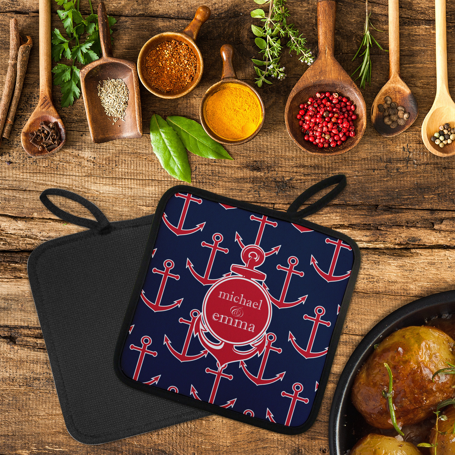 Our personalized pot holders feature a neoprene front that displays your personalization in vibrant colors. The backing of the hot pot holder is rubberized; the textured backing allows you to have a great grip when using this custom pot holder. The two materials are joined with a sleek, black trim, and the holder also includes an attached loop for hanging and storage. The pot holder is approximately 8.75 inches by 8.75 inches and 0.25 inches tall, while the fabric loop is 2.5 inches long. You can purchase a kitchen pot holder by itself or as a set of 2. We also offer a set including one pot holder and one oven mitt.