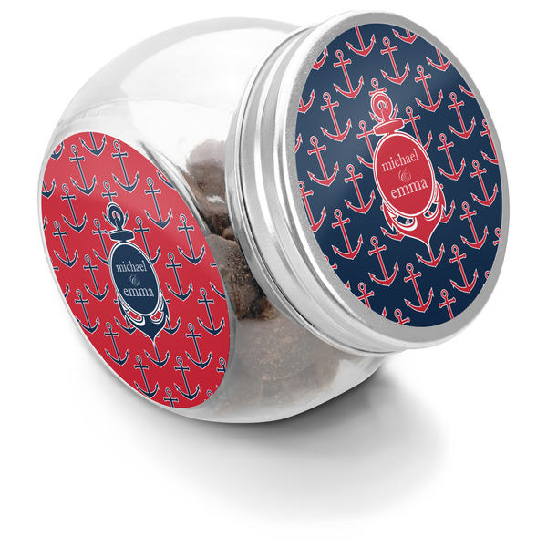 This treat jar is an excellent way to store treats for your favorite canine or feline. Moreover, their delicate, classy appearance makes them a tasteful addition to your countertop's décor. Crafted from clear glass, its unique construction and silver metal, screw-on lid allows for quick and easy access. Three, permanent, vinyl stickers are applied to both sides of the jar and lid, presenting your personalized design. The base of this glass, dog treat jar is 3.4" x 4.75", and the jar stands at 5" tall. Though on the smaller side, this jar is best suited for smaller treats or training treats.