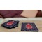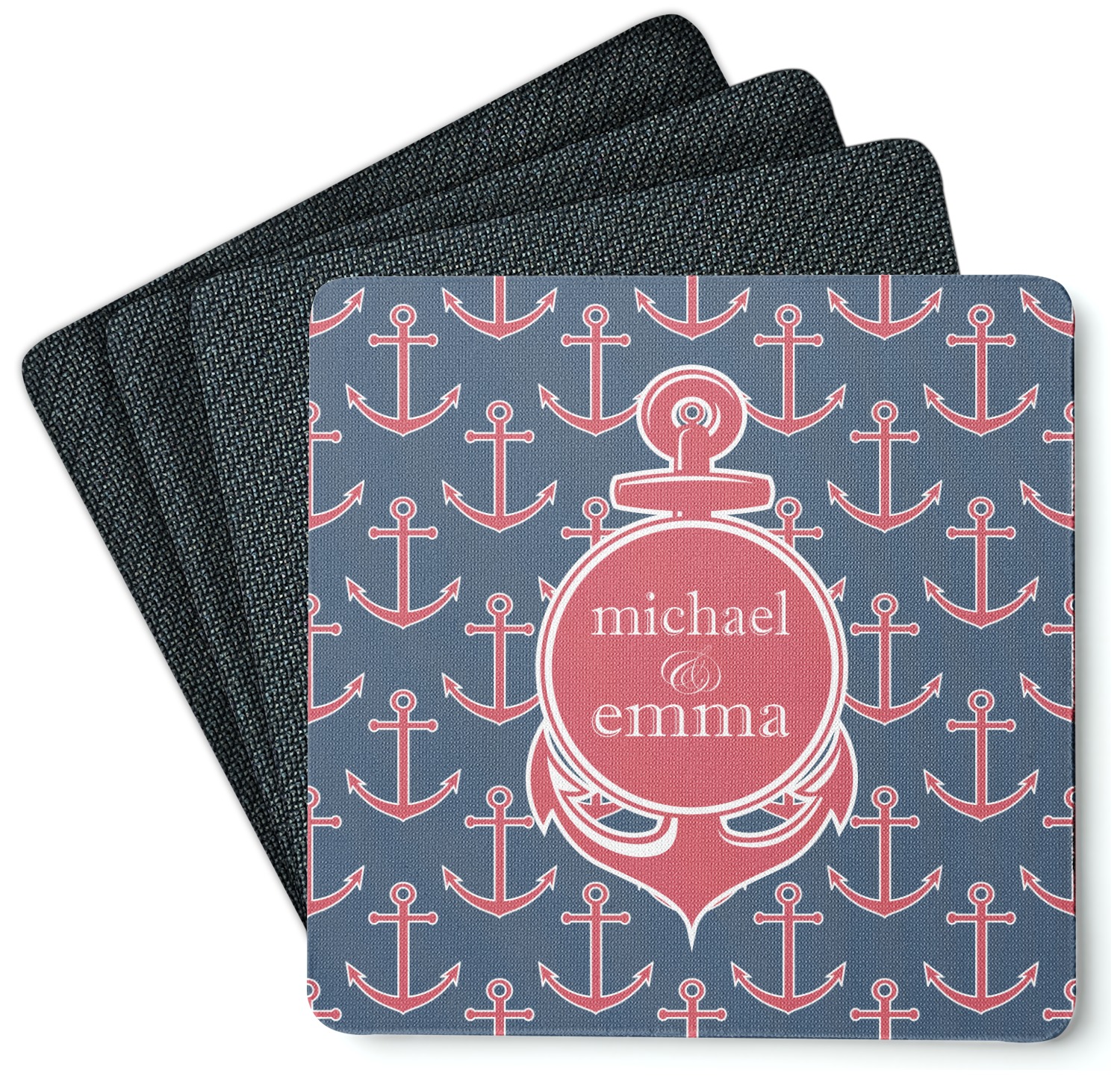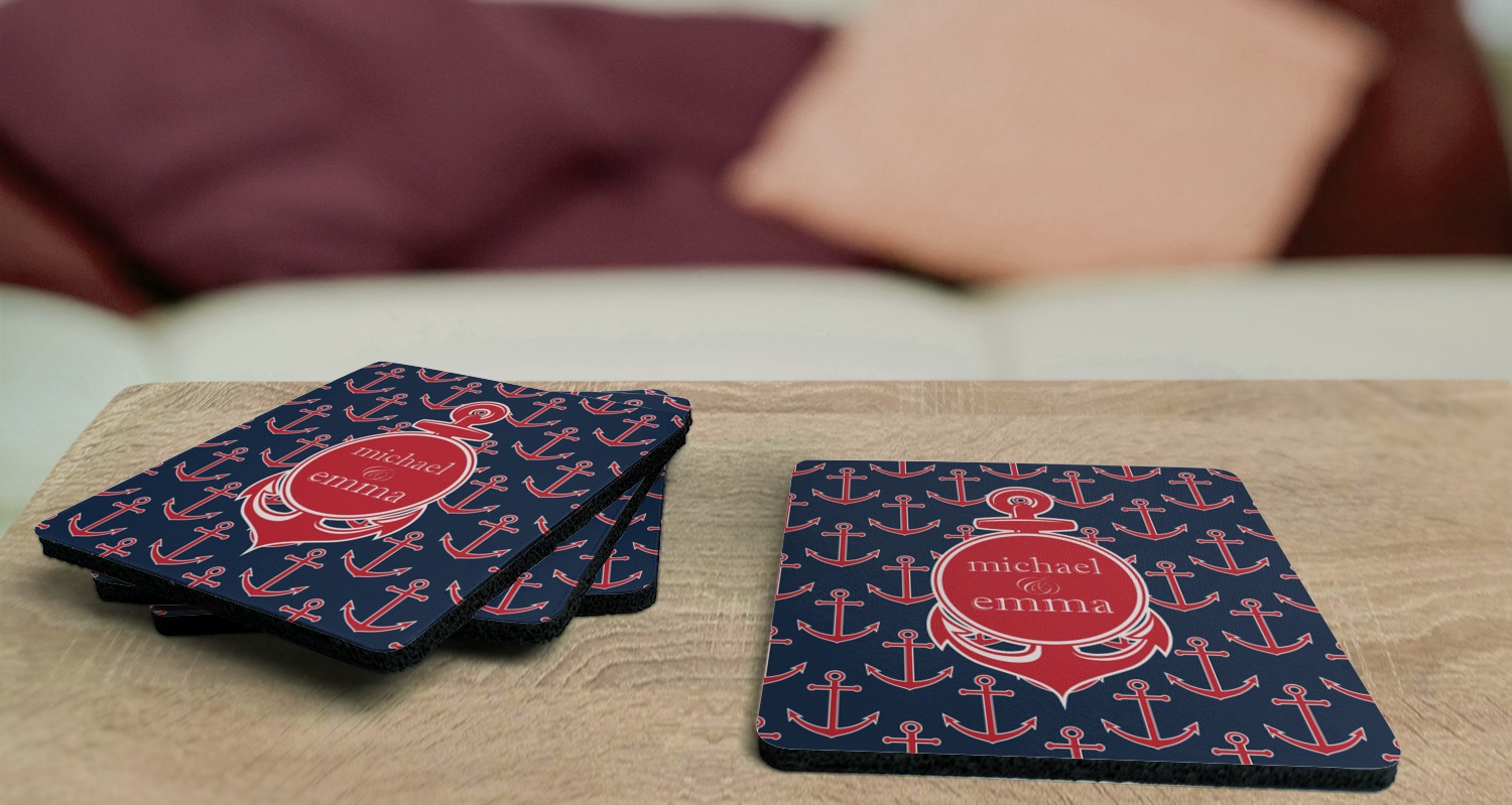 These drink coasters have a smooth, polyester top and a textured, rubber backing on its bottom. The non-slip rubber backing underneath works to keep any spills at bay. At 4 by 4 by 0.25 inches thick, these custom coasters are a suitable size for most drinkware. Your personalization is displayed atop the face of the cup coaster. We sell these rubber coasters in two different shapes: square and round. You can buy each shape as singulars or as a set of 4.