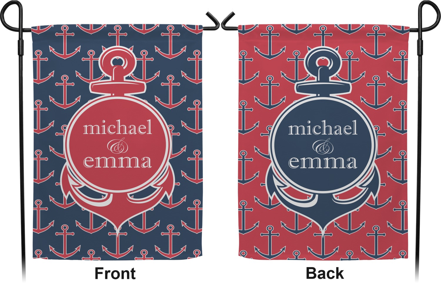These custom garden flags are made of a durable, double-ply, polyester weave, allowing them to withstand the elements year round. The small flags measure at approximately 12 by 18 inches. The large flags measure out to 28 by 37 inches. You can order these decorative flags with your customization printed on the front only, or the front and back.