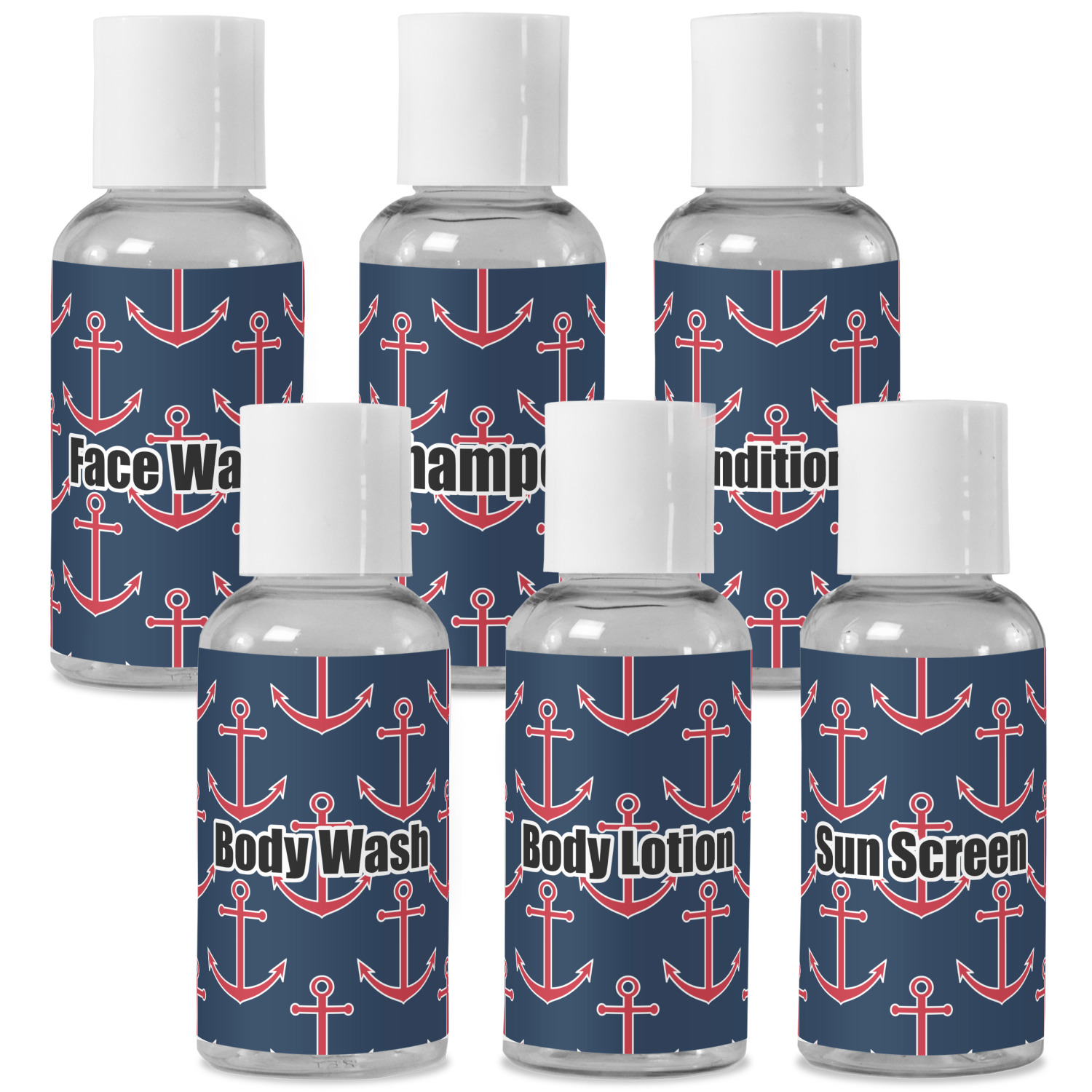 These soap and lotion travel bottles are the perfect place to start. Each set comes with 6 clear plastic bottles with white pop top lids. The bottles are cylindrical and can hold approximately 2.7oz. Perfect for plane travel!