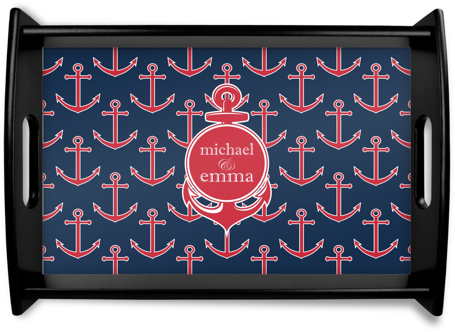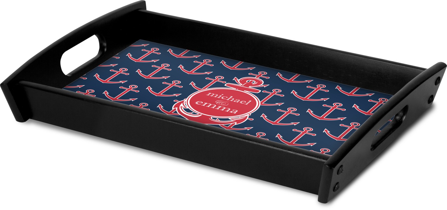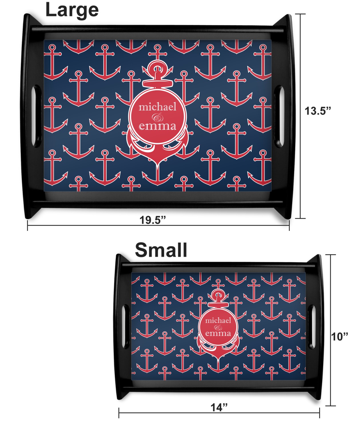 This serving tray with handles features square edges and two rounded sides, creating a very modern look. Each side is fabricated from a beautifully cut, natural wood. The bottom of the interior of the tray displays your customized design in bright, vibrant color. The tray is sold in both a black color and a natural wood look. Each variation of the wood serving tray has two sizes: Small, which is 14" x 10" x 2.25", and Large, which is 19.5" x 13.5" x 2.75".