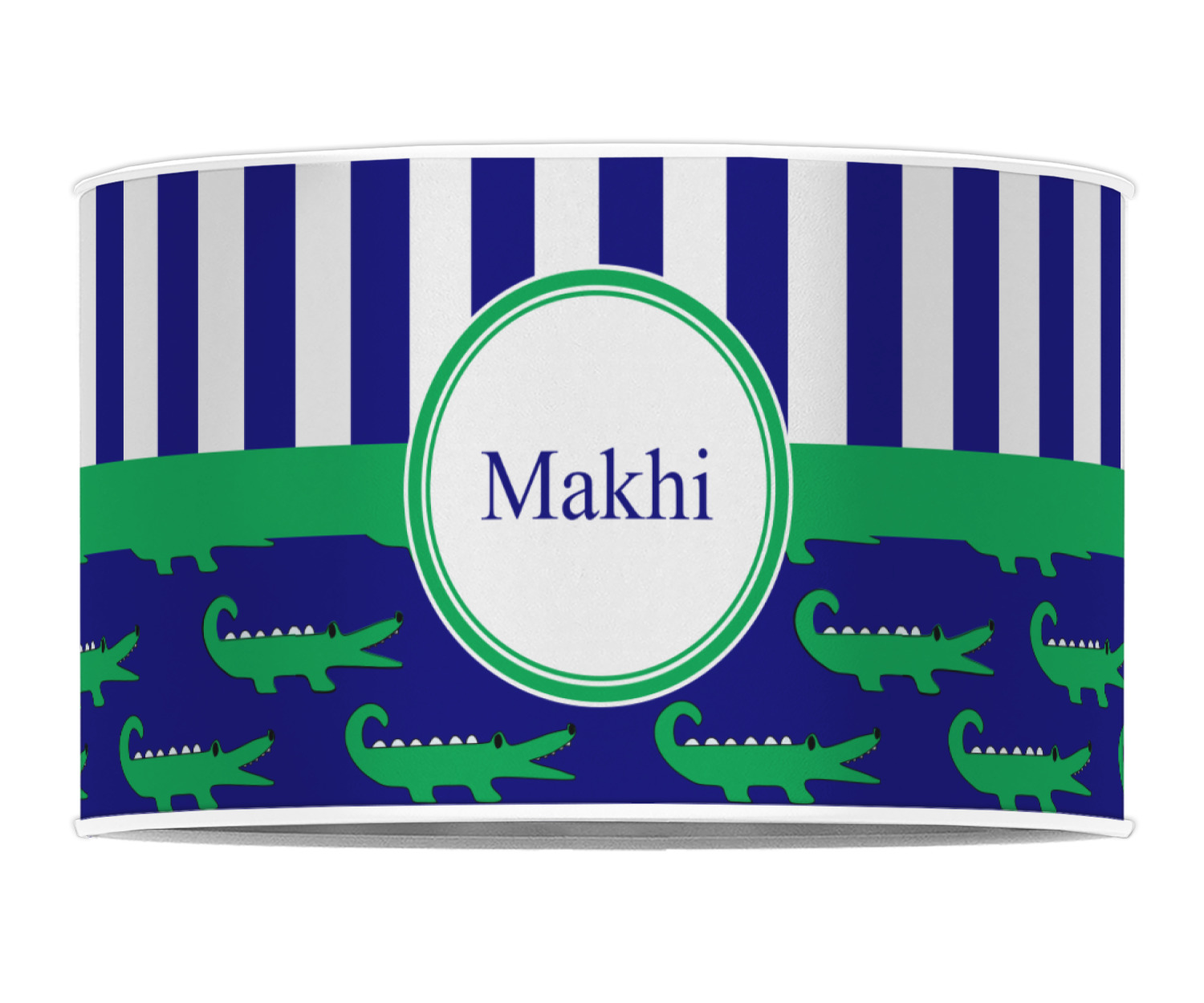 These are the sweetest alligators around! Our adorable green alligators pop and come alive on a blue background. To coordinate the alligator design a bold blue and white striped pattern is added to the top.