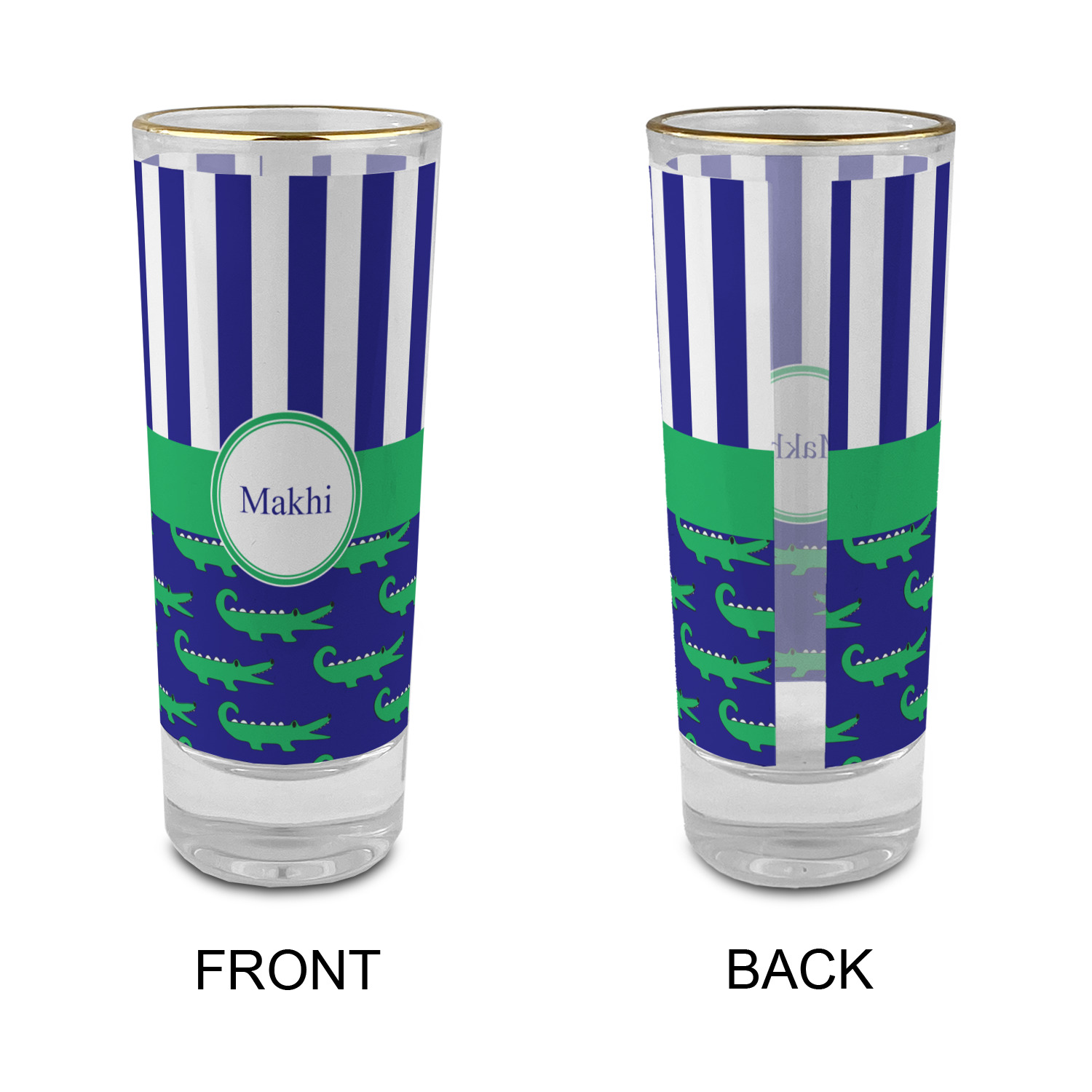 These glass shooter glasses are printed in full color with the design of your choice. These are a tall shooter 2 oz size and stand 4" tall. The print is a full wrap design to boldly display your personalization.